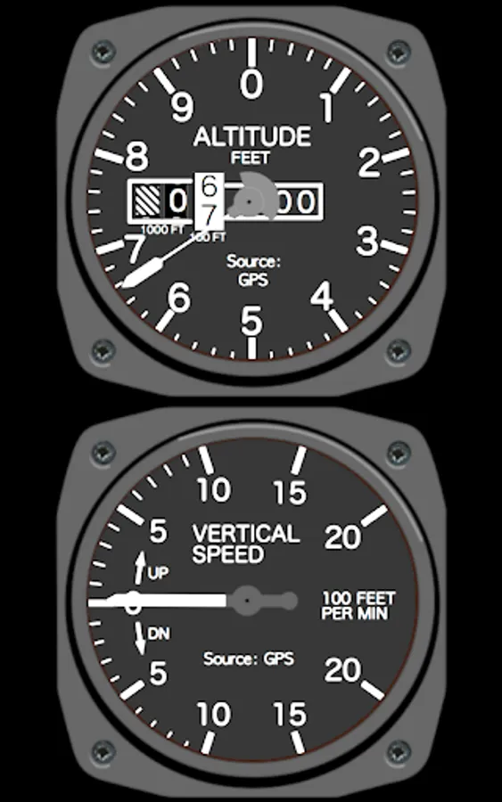 The Aircraft Altitude app recreates the two altitude related flight instruments that you find in almost all of past and present airplanes: Altimeter and Vertical Speed Indicator (also known as Variometer).