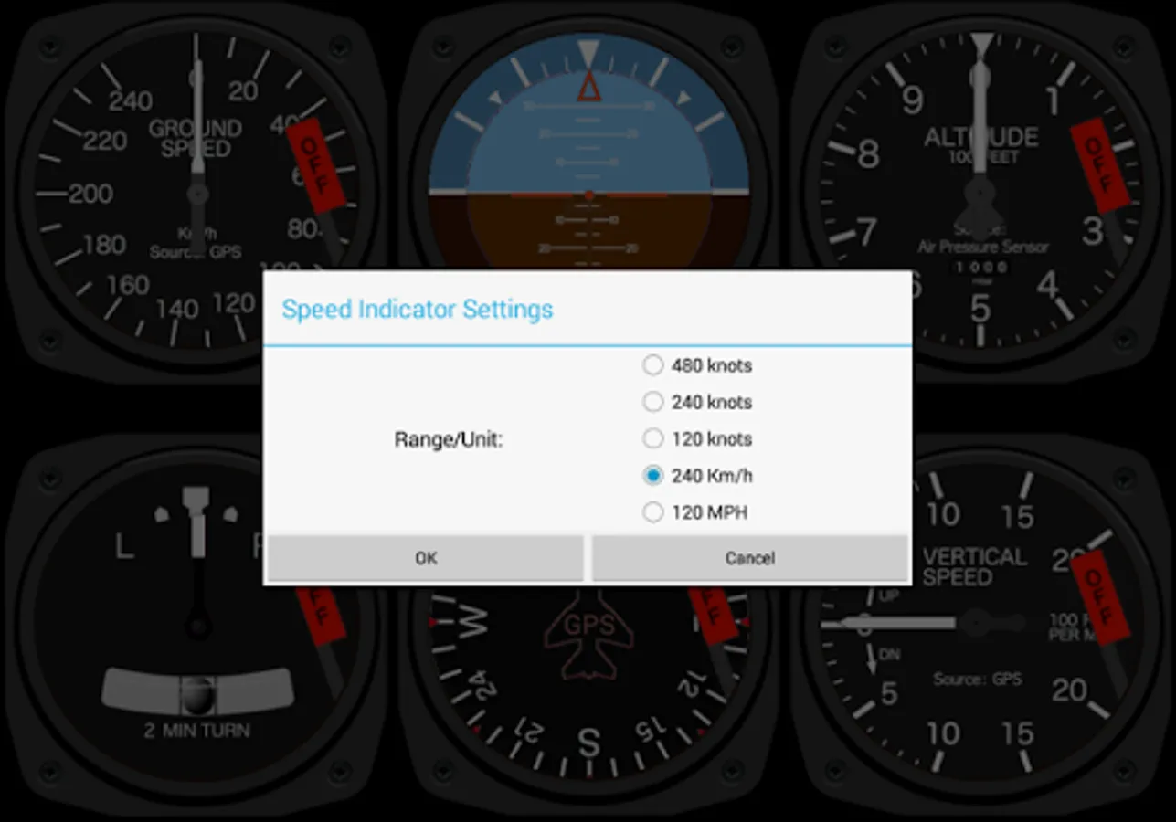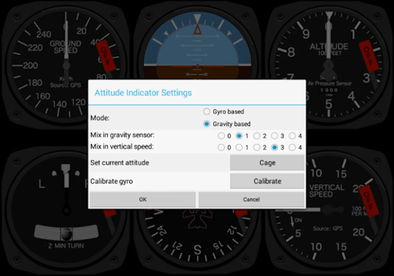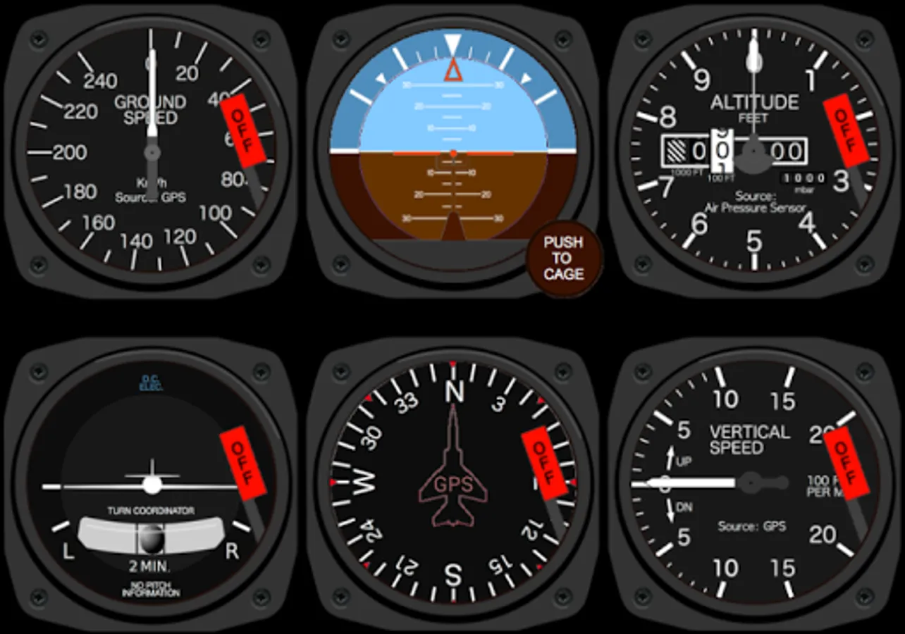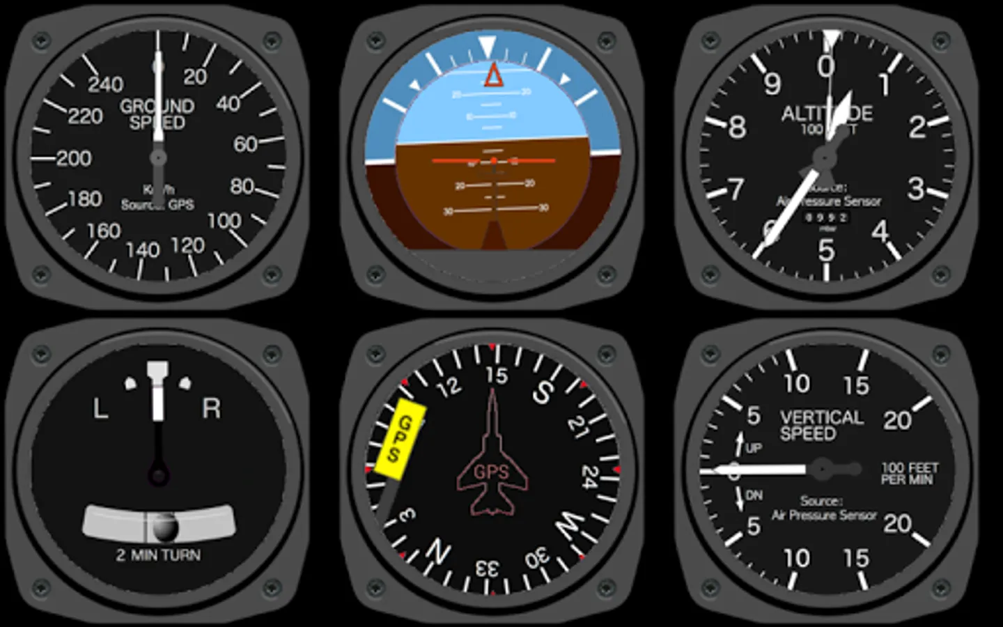 The Aircraft Cockpit app recreates the six main flight instruments (the six-pack) that you find in the majority of past and present airplanes: Speed Indicator, Attitude Indicator, Altimeter, Turn Coordinator, Heading Indicator and Vertical Speed Indicator.