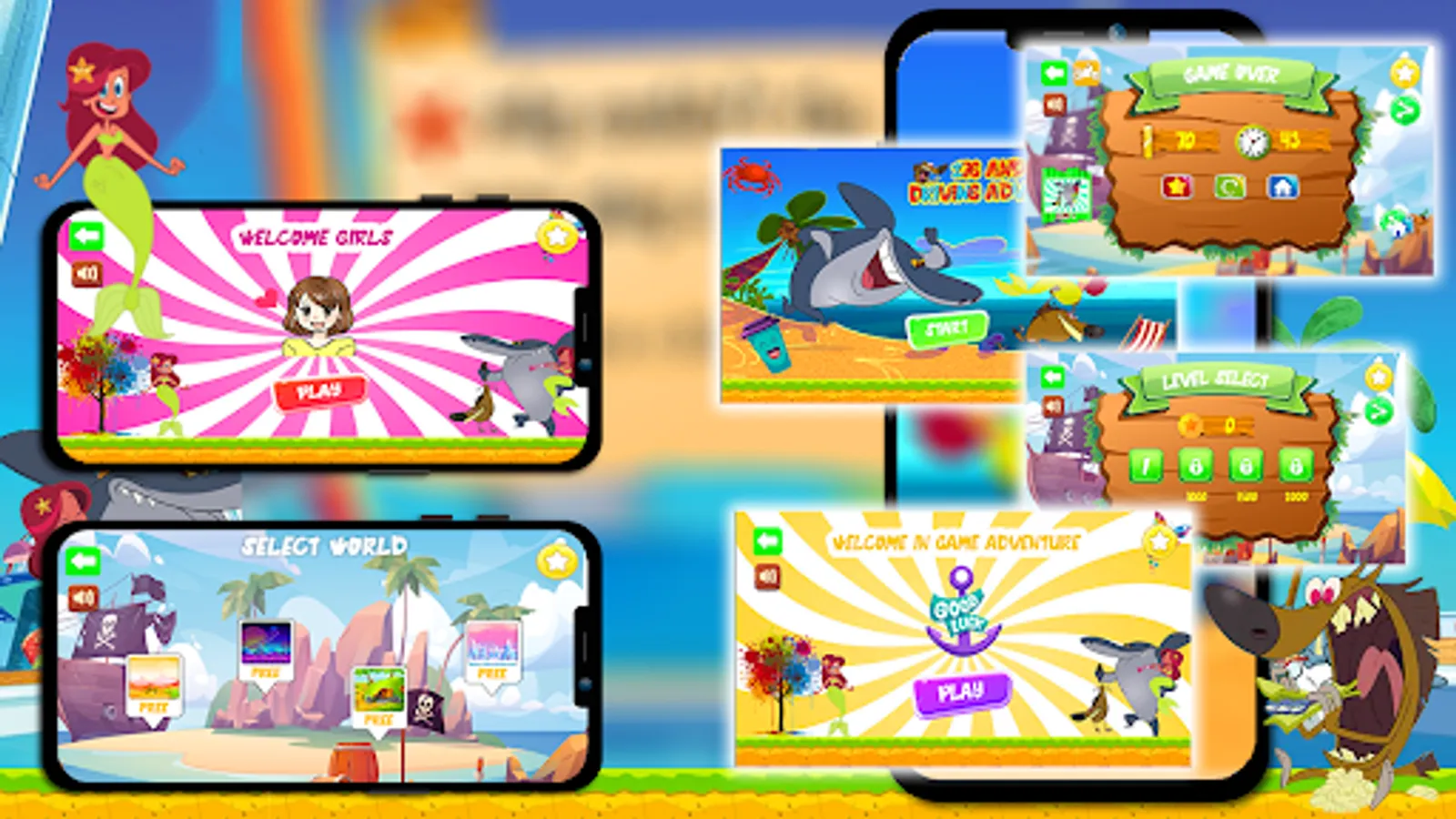The game Zig Sharko Adventure starts from the levels easy to difficult, it contains 4 worlds Each world contains 4 levels that start from easy to difficult, and if you want to open the three worlds you must collect the coins that are very important in the game, and the game contains many monsters
