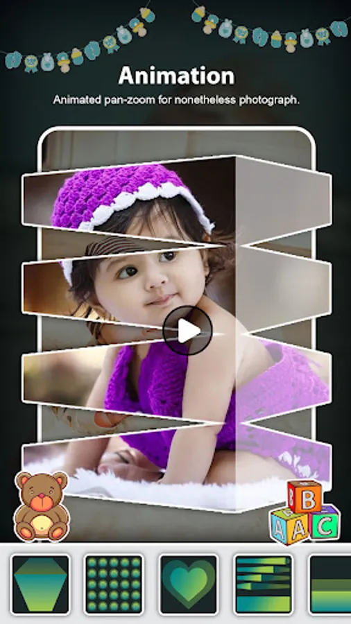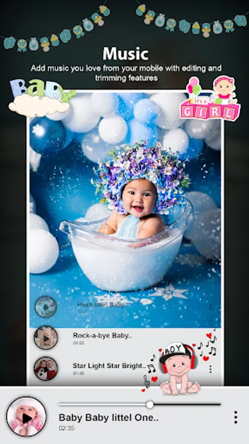 Baby Video Maker /for create a video in slide show style with your photos, music and frames. Baby Video Maker with Music app helps you to create Image Slide-show from your mobile in seconds, along with slide time, frames and filter effects. Create beautiful Music Slideshow and share with friends and family for best occasions in life.