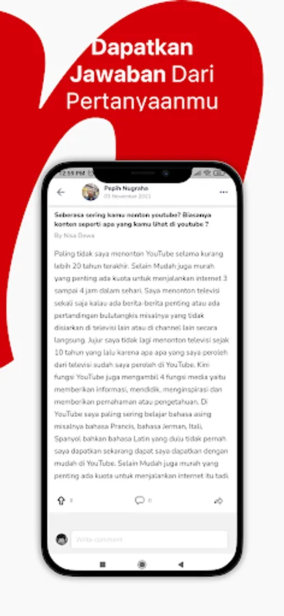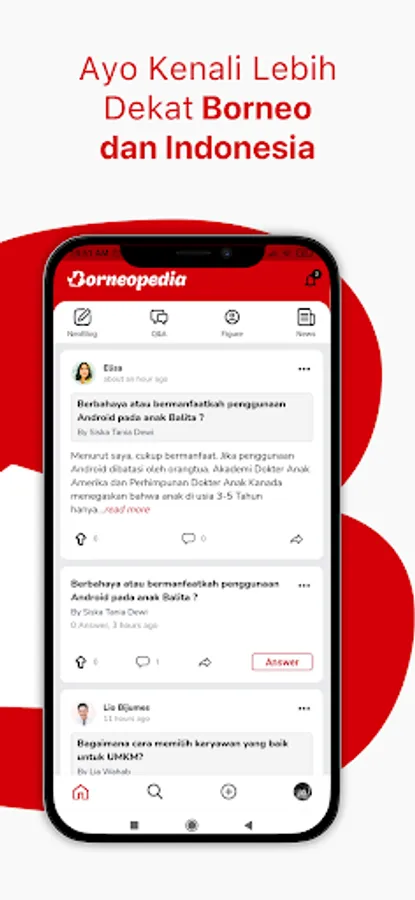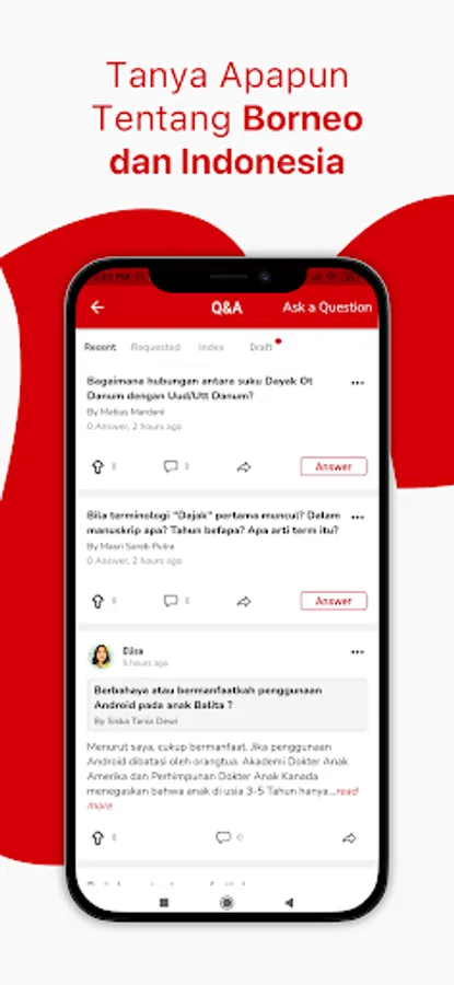 Fitur tanya jawab apa saja tentang Kalimantan. Pengguna Borneopedia yang membutuhkan informasi terkait Kalimantan, dapat menanyakan hal tersebut di fitur Q/A (Question/Answer). Borneopedia menyediakan para ahli, tokoh publik, dan pakar lainnya yang siap menjawab pertanyaan apa pun tentang Kalimantan. Anda bebas bertanya apa saja tentang Kalimantan, Borneopedia menyediakan jawabannya. Selain itu, Borneopedia juga memberikan kesempatan kepada setiap pengguna untuk berpartisipasi dalam menjawab pertanyaan yang diajukan oleh pengguna lainnya. Dari Anda dan untuk Anda.