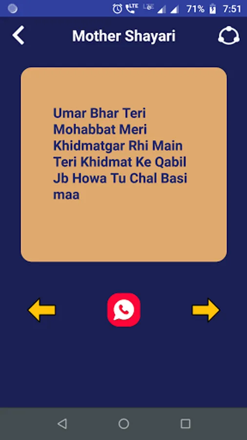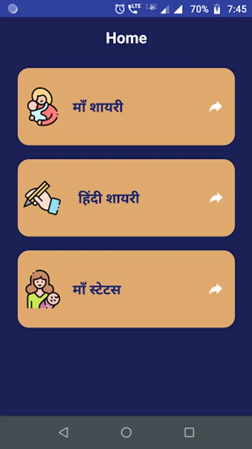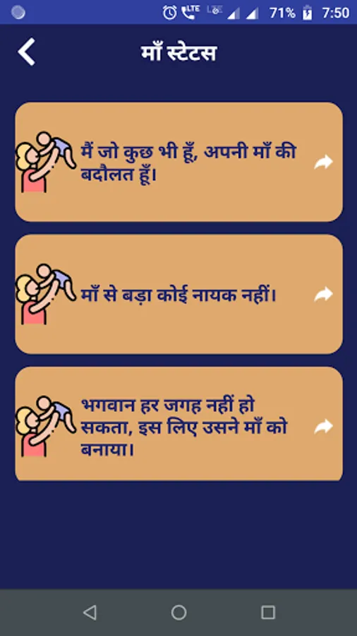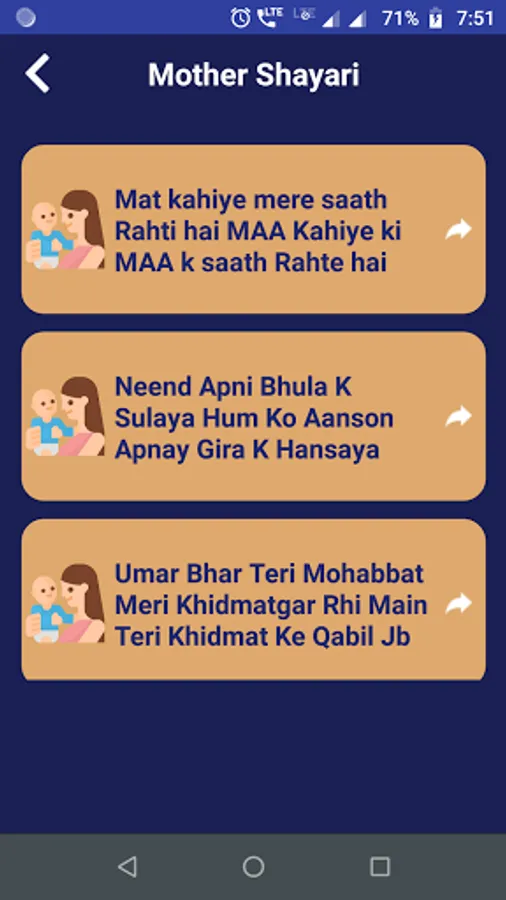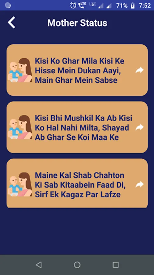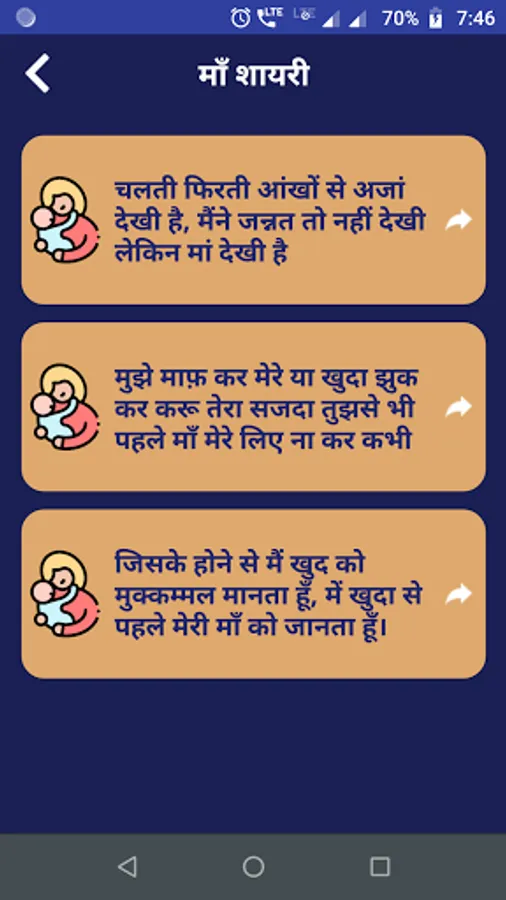 This app brings you the best collection of mother shayari & Mother Status in hindi. Beautiful poem on mother in hindi. These shayari on mother can be sent as an SMS to mobile or as a WhatsApp message or it can also be used as a new social media status.