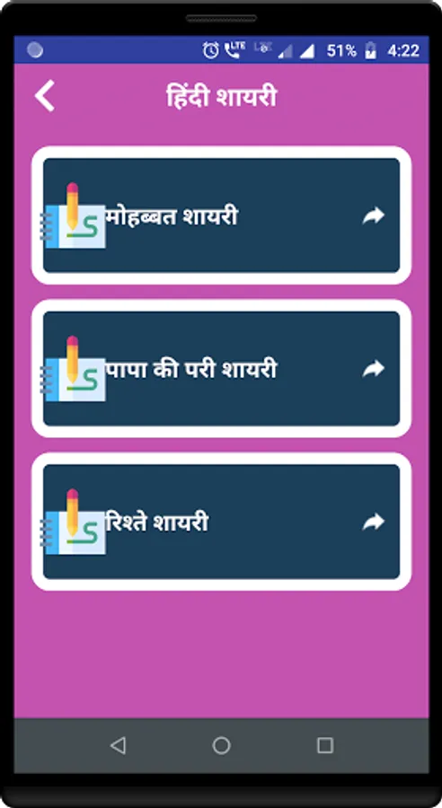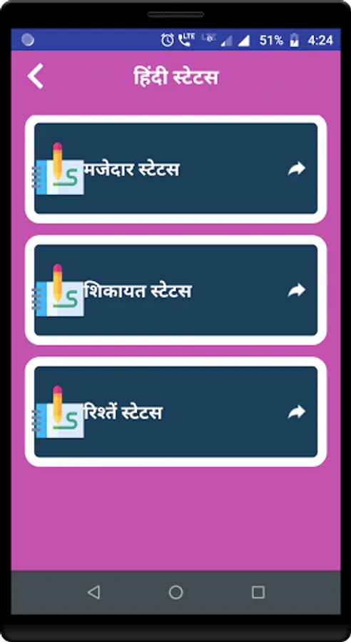 Under this app you can find well categorized collection of Hindi Shayari and Hindi Status which you can share with your friends.