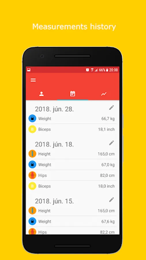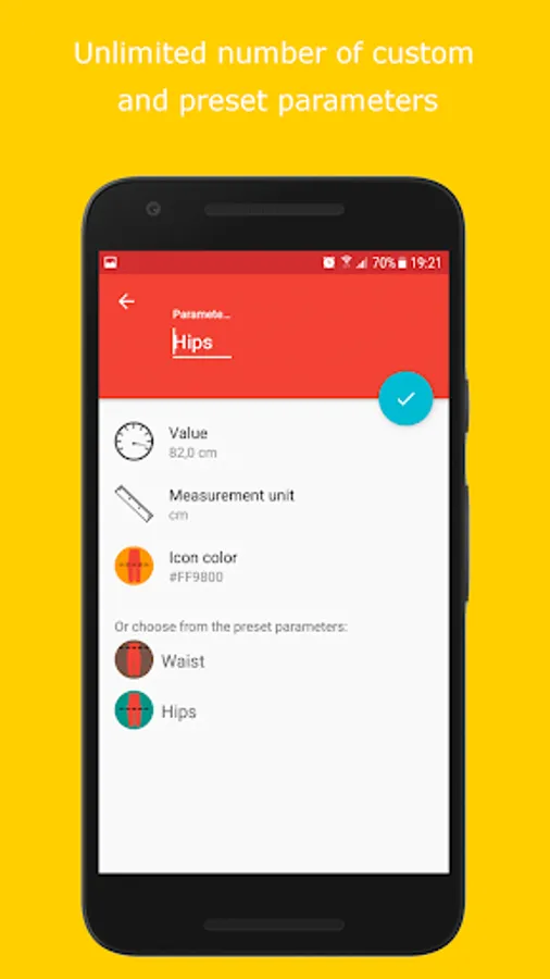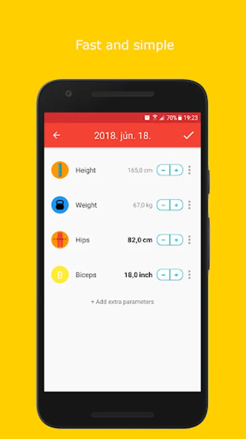 Body Measurement Tracker allows you to keep track of an unlimited number of parameters of your body. Measure your height, weight, hips, waist or any other part of your body you want to develop. This app allows you to customize the list of measurements. You can decide to measure your left and right biceps separately or just one of them. You want to measure your calves or any other fitness measurement ? Just add a new parameter to your list.