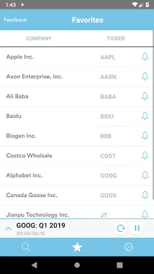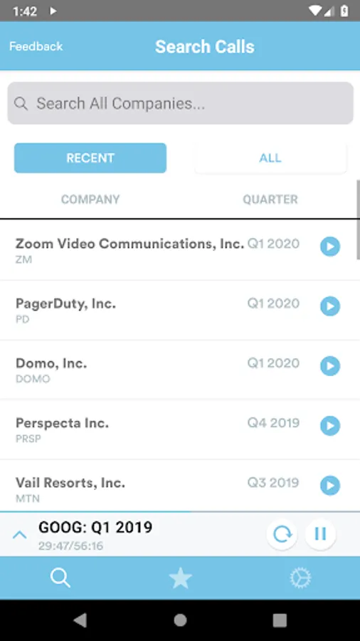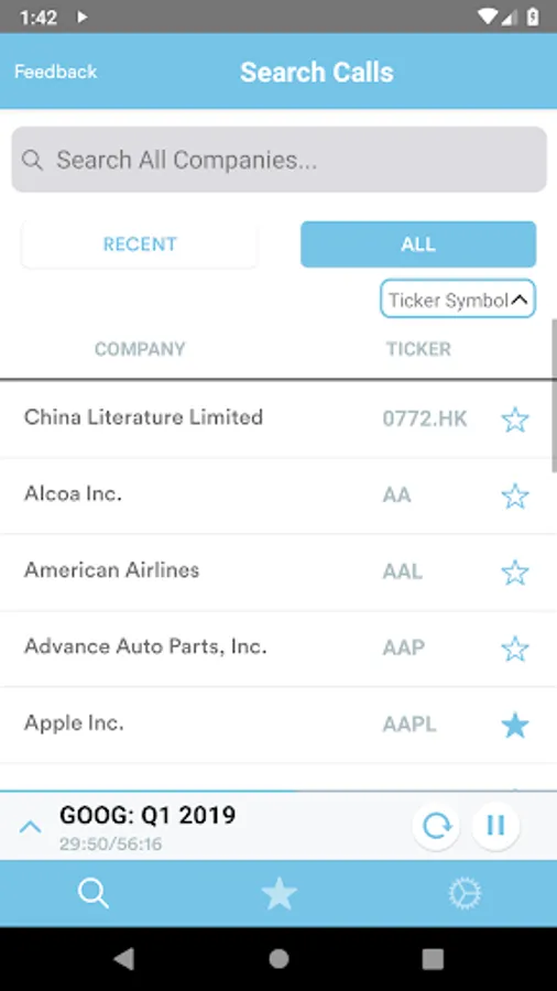 - Requesting A Company: Hit the "Feedback" button and let us know which companies you'd like us to add. We have thousands of earnings calls and we're adding more and more companies every day. Your request will get top priority and will be added to our app promptly. Feel free to be greedy and request as many companies as you want (we get it, you love earnings calls). (available for all users)