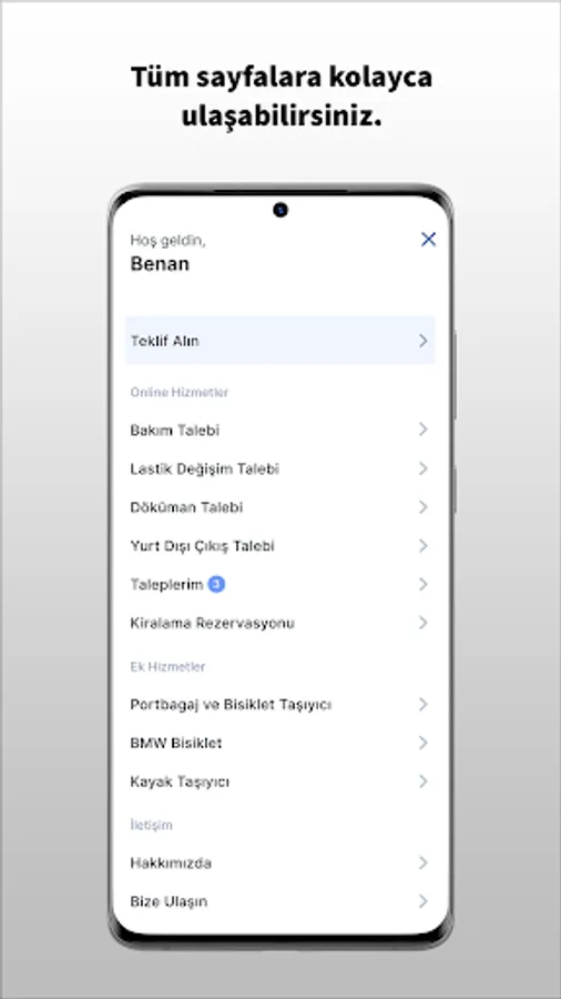 With this application, you can follow our campaigns and get offers for our rental cars. You can request maintenance, damage notification, tire change request, document request, departure abroad and view the nearest authorized service information for your rented car. You can request for ski carrier, bicycle and roof rack services on your holiday trips. In case of damage, you can quickly reach our contact center with the SOS button. You can also view the details of your contract.