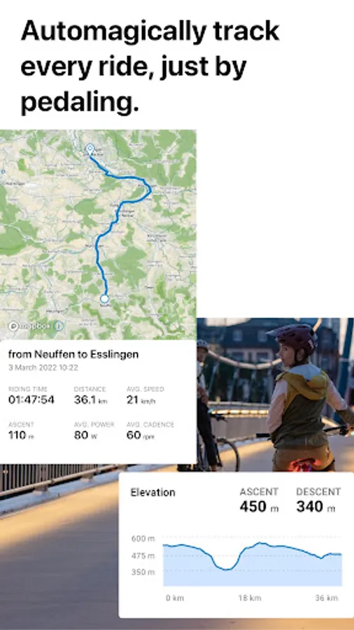 Just ride and eBike Flow automatically records your tour and fitness data. If you like, you can also sync your data to Apple Health, komoot and Strava. And it's all fully automatic - you don't have to worry about a thing. Well, you should still steer ;-)