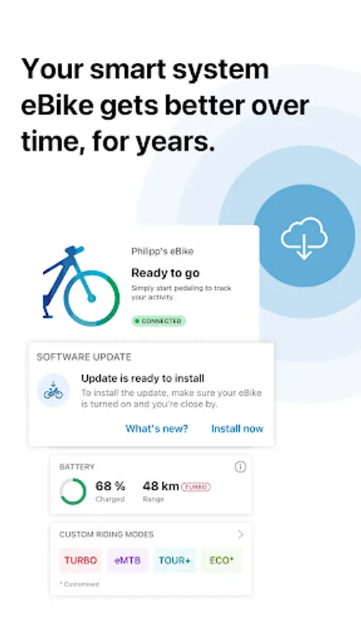 With the app, your eBike is always up to date and benefits from updates and improvements as they are made available. You can easily download new eBike functions and updates for components such as the battery or motor and transfer them to your eBike via Bluetooth.