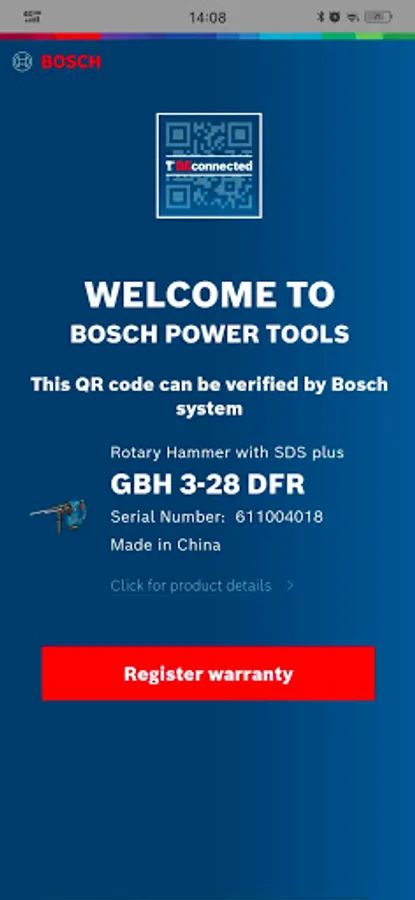 - Scanning QR code and register your Bosch power tools to get paperless warranty.
