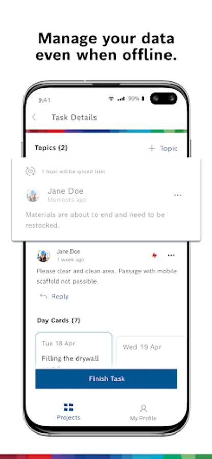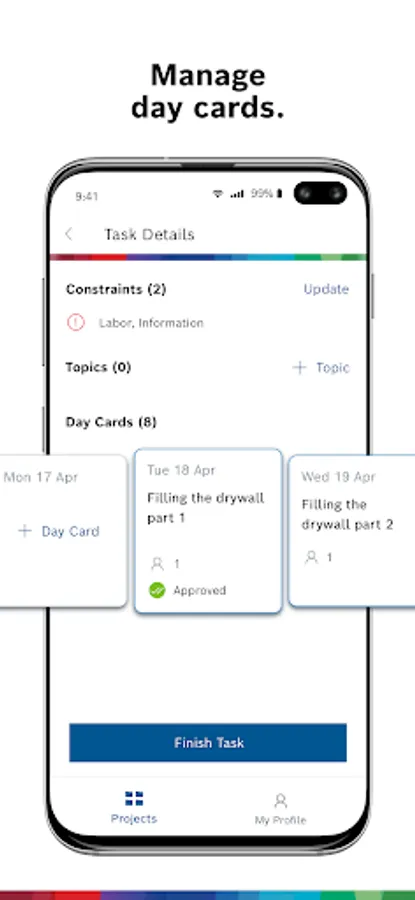 The app enables you to view all your upcoming tasks, change the status of your tasks, or communicate using the topics function. Quickly and easily view day cards in more detail and create new ones on the go.