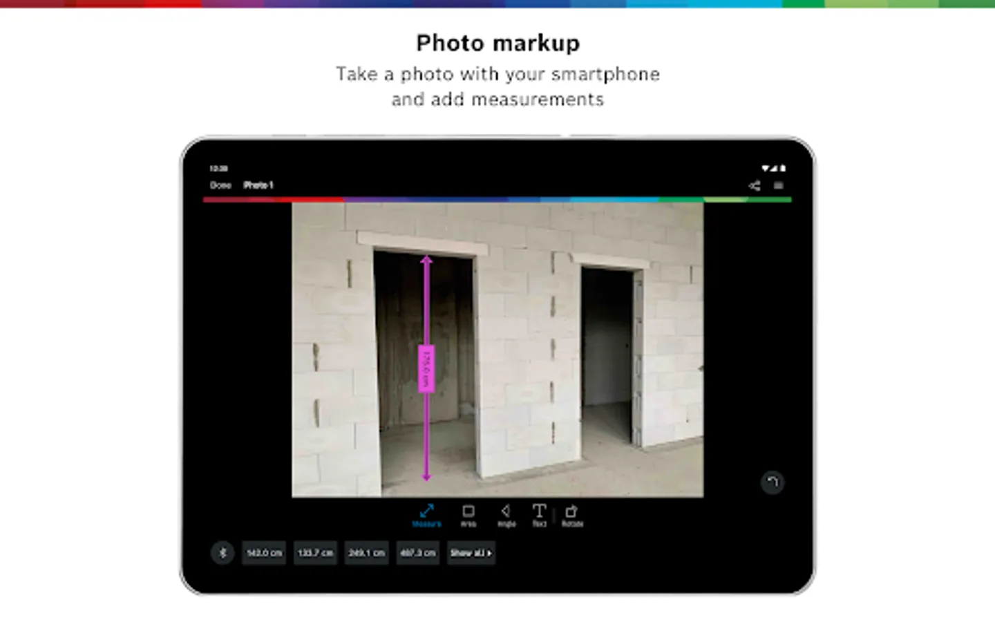 Save all information in one place: MeasureOn by Bosch Measuring Tools is your app for easy on-site documentation of floor plans, measurements, photos, and notes.