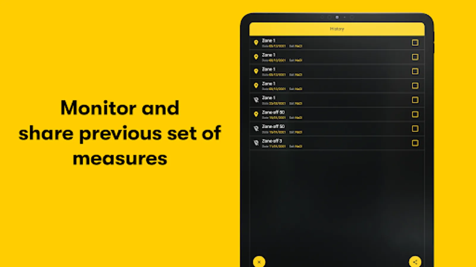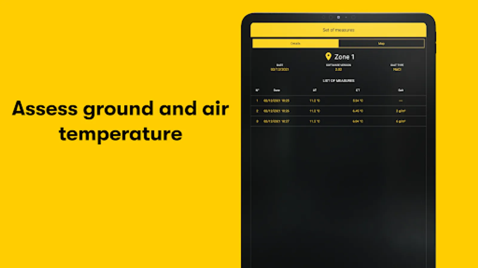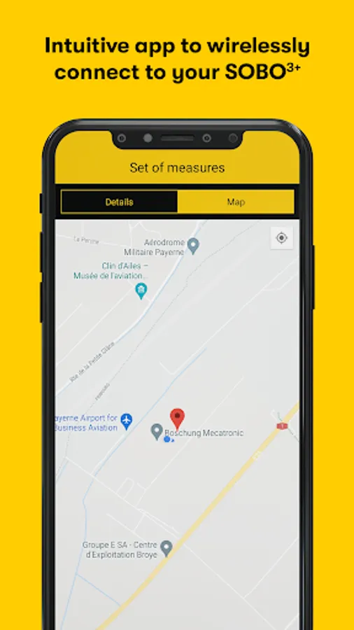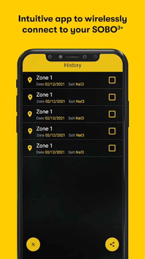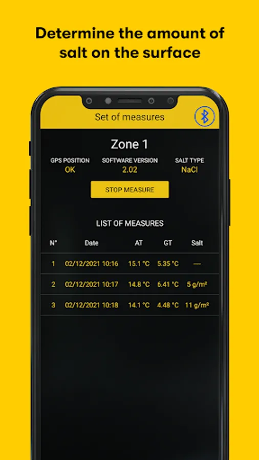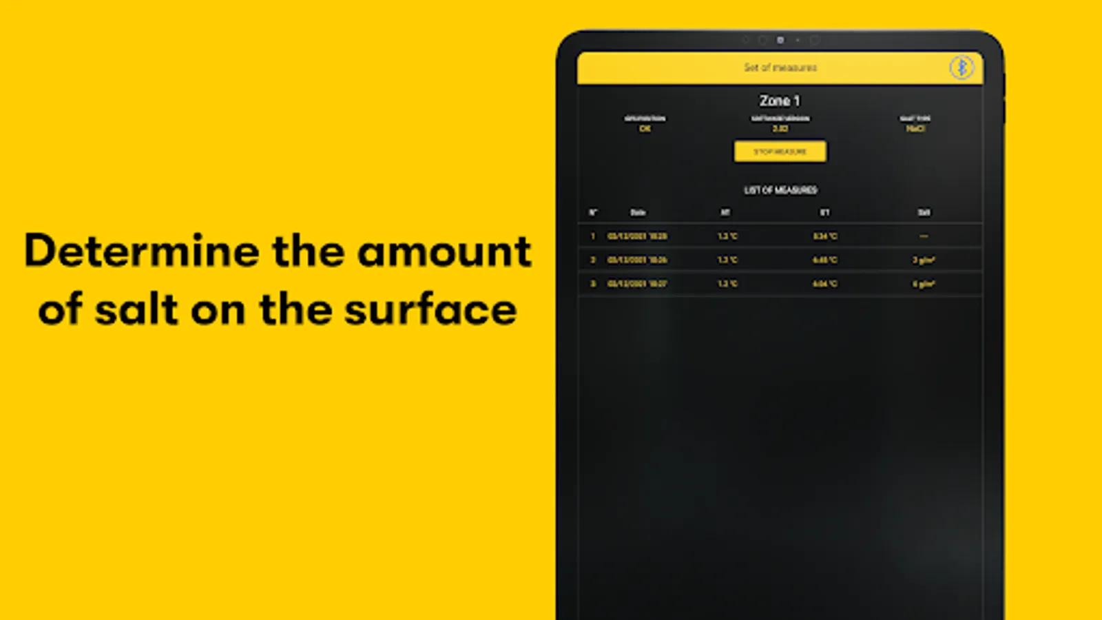 The SOBO determines the amount of salt on the road by measuring the electrical conductivity. To do this, a known volume measurement solution is sprayed on a determined road surface. The salt present on the measured area is dissolved and the conductivity of the solution is measured. The salt concentration, in g/m2, is then displayed on the screen and sent via bluetooth to the SOBO application. The SOBO application allows you to view, save and send the results of concentration and/or temperature measurements by e-mail as a PDF-document. The measuring solution is configurable according to the ambient temperature, the choice of demineralised water or an acetone/water solution 15%. The type of salt present on the road must also be set, either NaCl or CaCl2. The built-in temperature compensation device ensures that the measurement result is independent of the temperature at which the measurement is made.