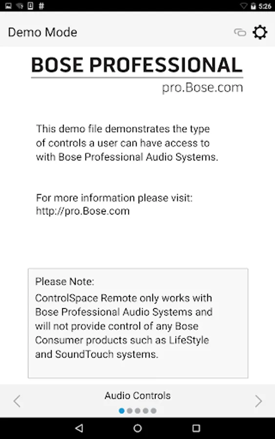 Designed for end users of audio systems using Bose® Professional networked electronics, the ControlSpace® Remote app provides intuitive and personalized wireless control for increased convenience and utilization of installed sound systems.