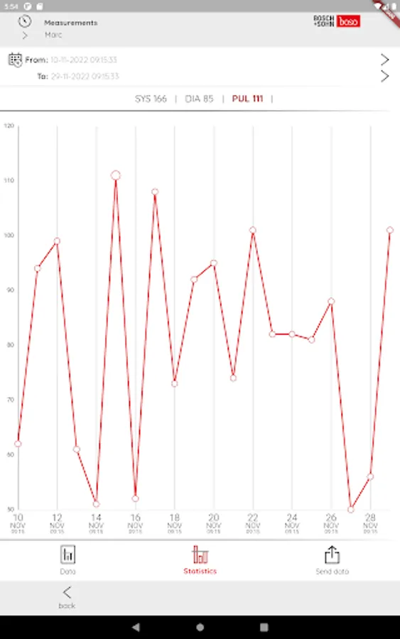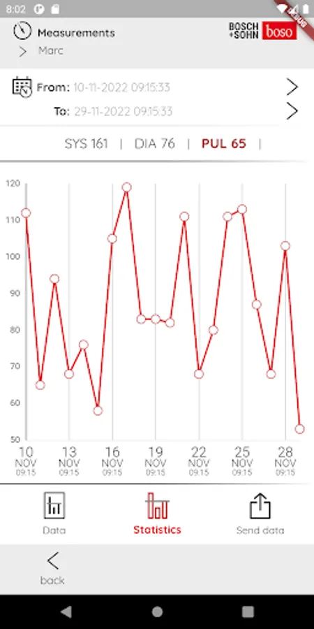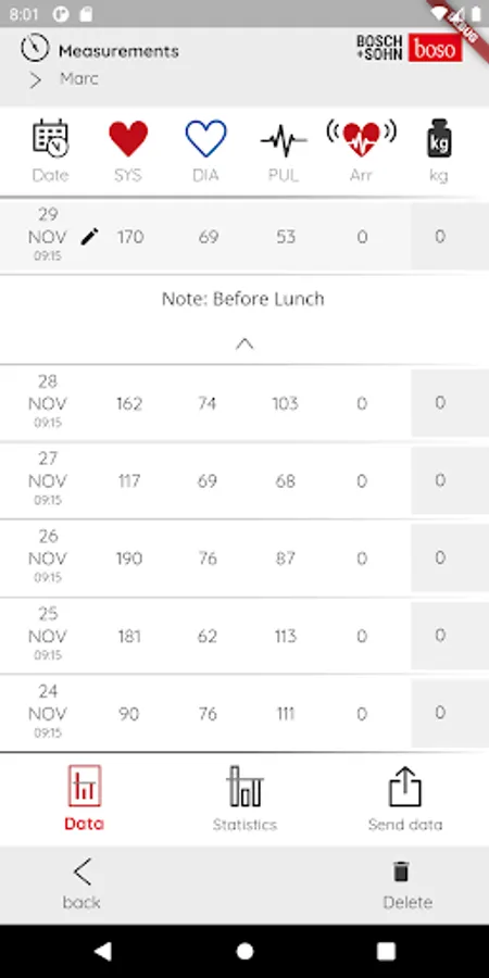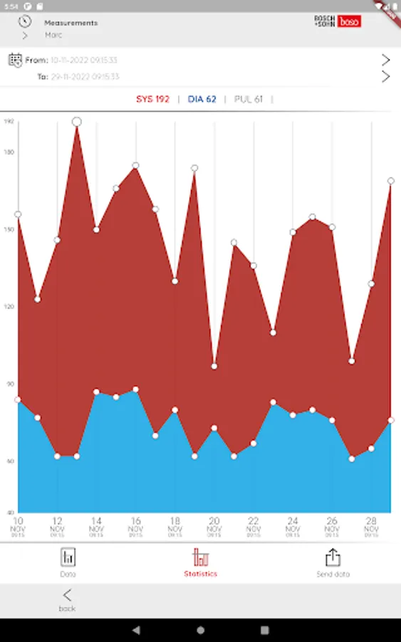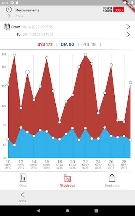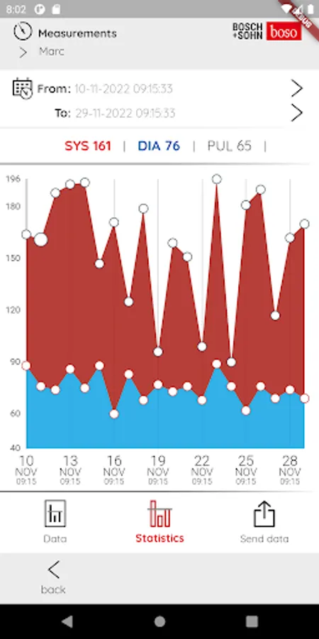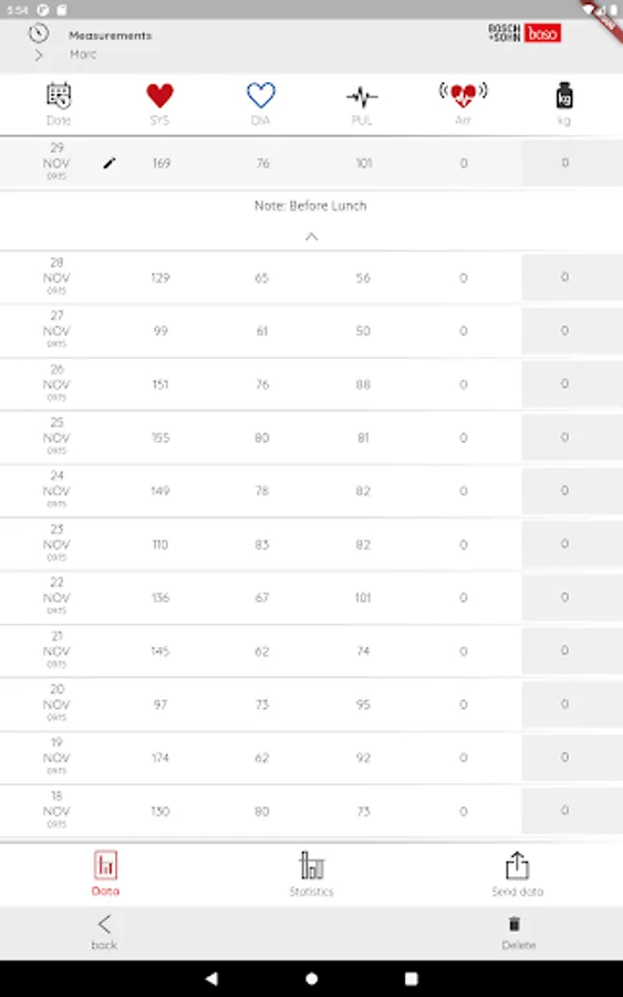 Transfer of measured values to your Android device for optimal control of vital parameters. Storage and analysis of blood pressure, pulse, any arrhythmias with the devices boso medicus system. Weight values can be recorded manually, BMI is calculated. For professional evaluation with long term profile and report sending by eMail. Connection to the PC evaluation software boso profilmanager XD Home via XML export.