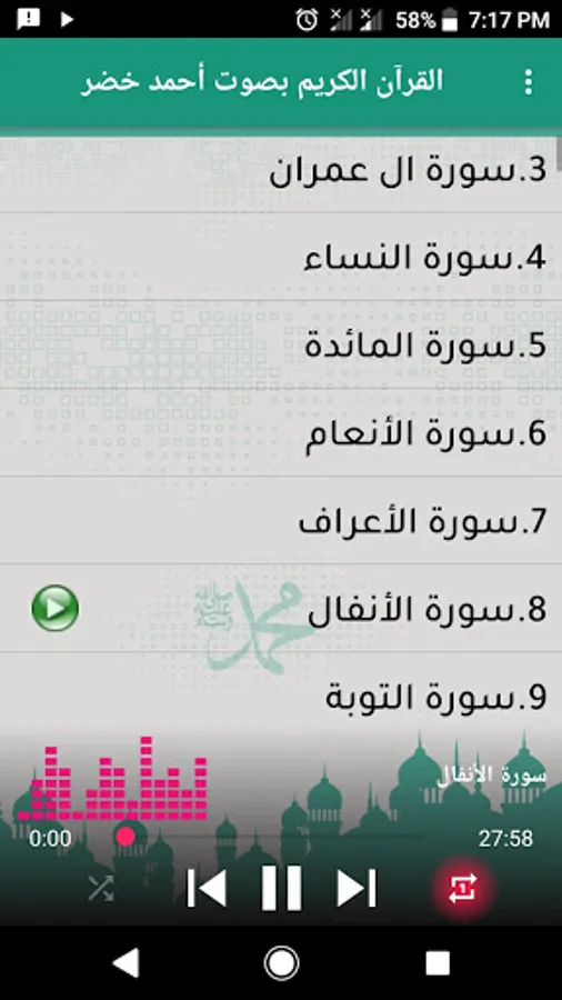 The application of the Noble Qur’an with the voice of Ahmad Khader al-Trabelsi enables you to listen to all the surahs of the Holy Qur’an after specifying the name of the surah you want to listen to, which Sheikh Ahmad Khader al-Trabelsi recites in each surah.