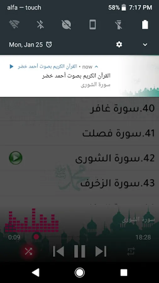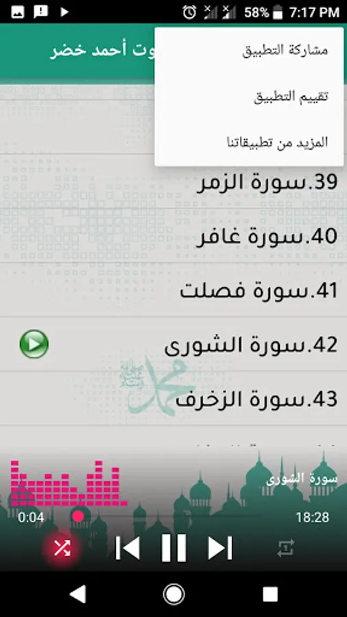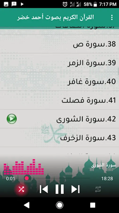 By pressing the (Next Surah) and (Previous Surah) button, you can listen to the previous surahs of the surah that you listen to, as well as the following surahs, and the program also shows you the duration of each surah so that you are aware of this.