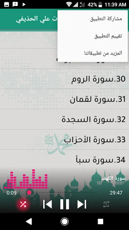 As we mentioned, the interface of the application of the Noble Qur’an with the voice of Ali Al-Hudhaifi is a simple interface that enables users, young or old, to listen to the Holy Qur’an and use the application with ease away from complexity.