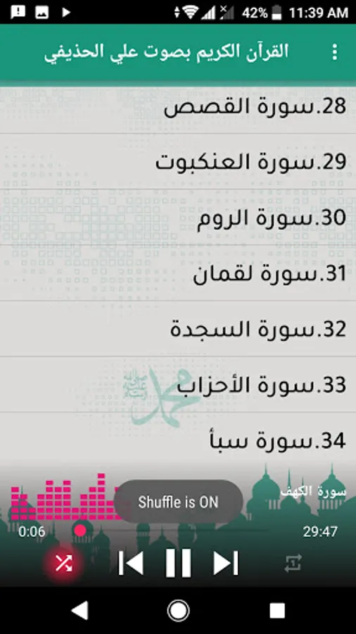 By pressing the (Next Surah) and (Previous Surah) button, you can listen to the previous surahs of the surah that you listen to, as well as the following surahs, and the program also shows you the duration of each surah so that you are aware of this.