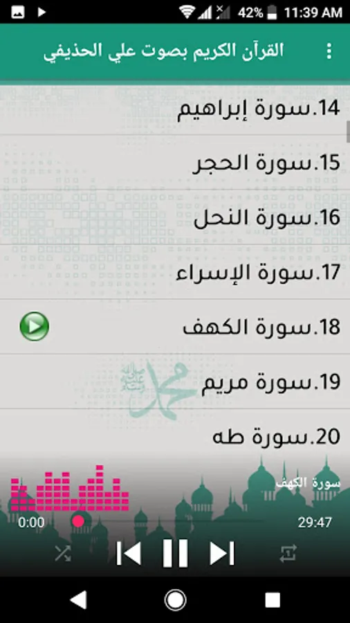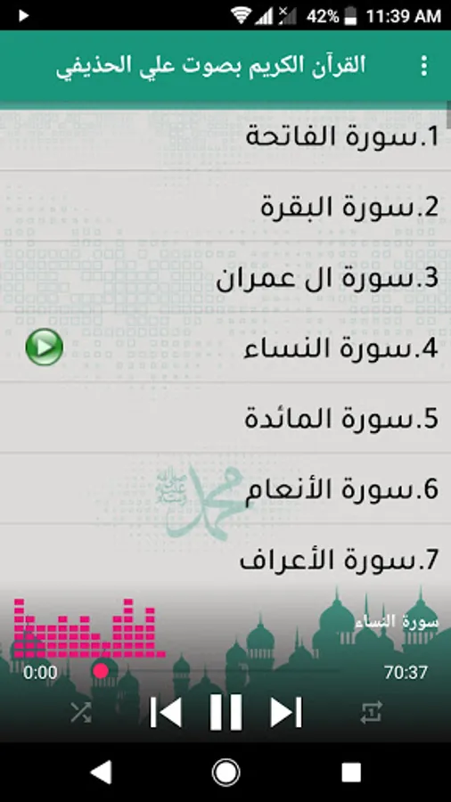 The application of the Noble Qur’an with the voice of Ali Al-Hudhaifi enables you to listen to all the surahs of the Noble Qur’an after specifying the name of the surah you want to listen to, which Sheikh Ali Al-Hudhaifi recites in each surah.