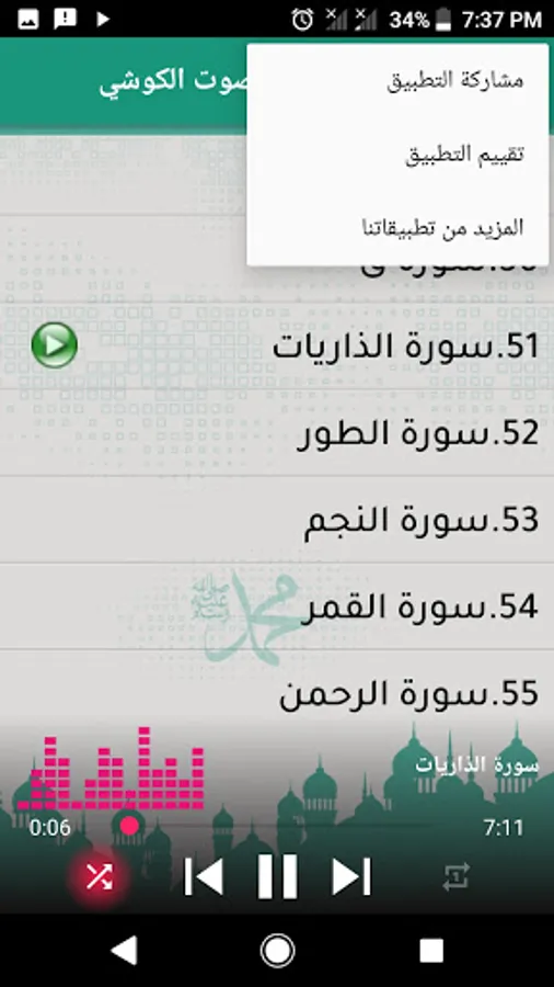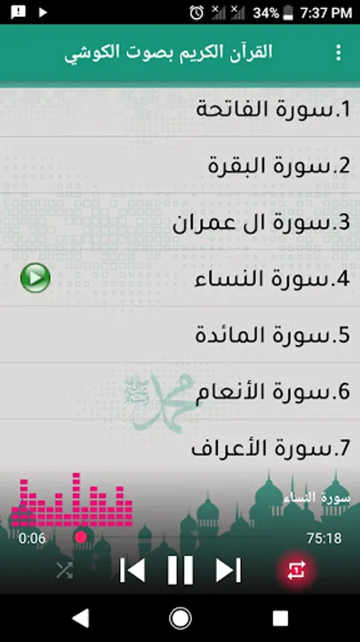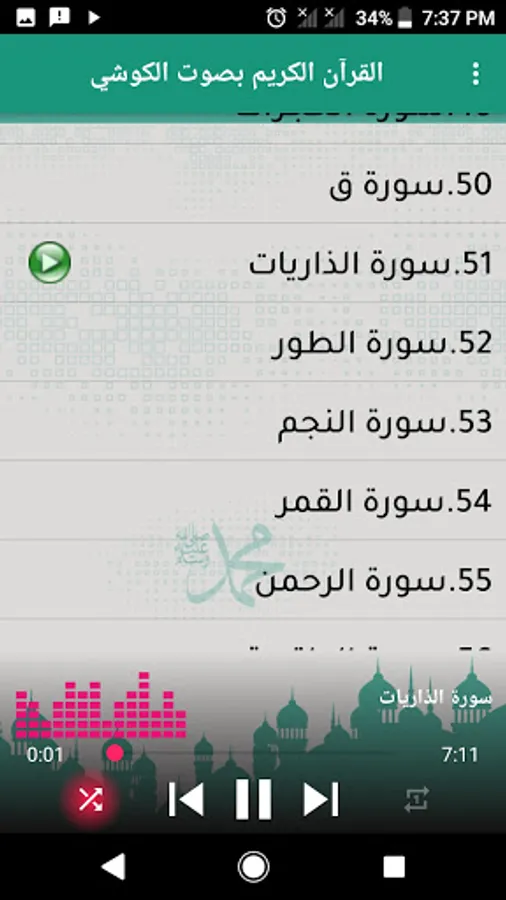 By pressing the (Next Surah) and (Previous Surah) button, you can listen to the previous surahs of the surah that you listen to, as well as the following surahs, and the program also shows you the duration of each surah so that you are aware of this.