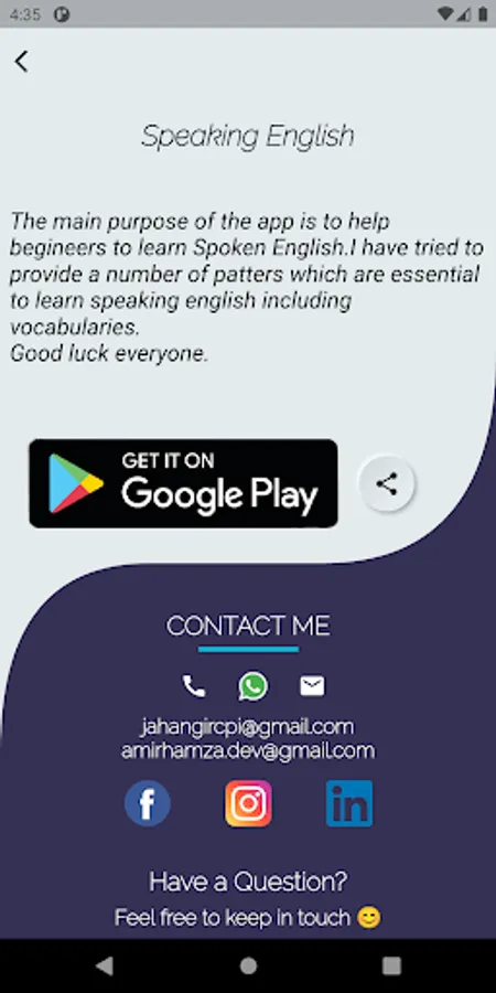 This app (Speaking English) will help those who want to learn to speak English from the very beginning because this app has all the necessary rules, patterns and practices. If someone wants to find someone to speak English, you can get it in this app and you can also attach your WhatsApp number so that someone else can find you. If you want, you can record your voice in this app and you can also share it. Many rules have been given to correct English pronunciation.