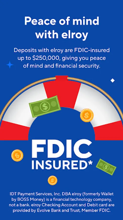 📝 Note: IDT Payment Services, Inc. DBA elroy (formerly Wallet by BOSS Money) is a financial technology company, not a bank. elroy Checking Account and Debit card are provided by Evolve Bank and Trust, Member FDIC. Your deposits are FDIC insured up to $250,000 through Evolve Bank and Trust. The elroy Mastercard® Debit Card is issued by Evolve Bank and Trust, Member FDIC, pursuant to a license from Mastercard®. See your applicable cardholder agreement for details. Money transfer services are provided by IDT Payment Services, Inc., a licensed money transmitter (NMLS 935577, MA FT935577), or IDT Payment Services of New York LLC, licensed as a Money Transmitter by the New York State Department of Financial Services. 520 Broad Street, Newark, NJ 07102