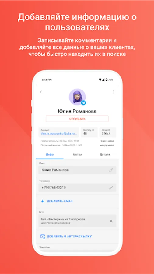 Convert cold traffic from social networks into subscribers with a conversion rate of up to 70% and collect email and phone numbers of customers directly in the messenger. Fully automatic without manual correspondence.