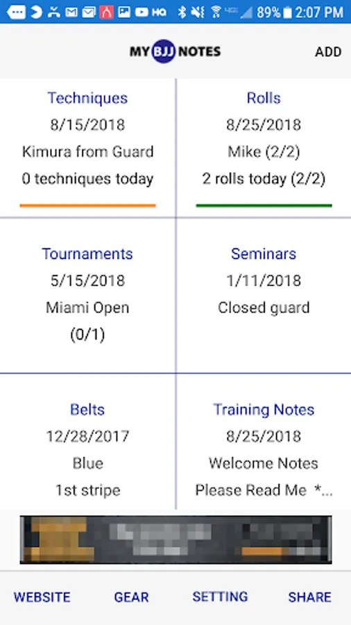 The Training Notes function is for making general notes about training. Did your Professor mention an upcoming seminar? Make a note of it. Did you notice a training partner do something that you liked? Make a note about it. The note consists of a date, title, and your note and any pics or video you want to take that relates to that particular note.