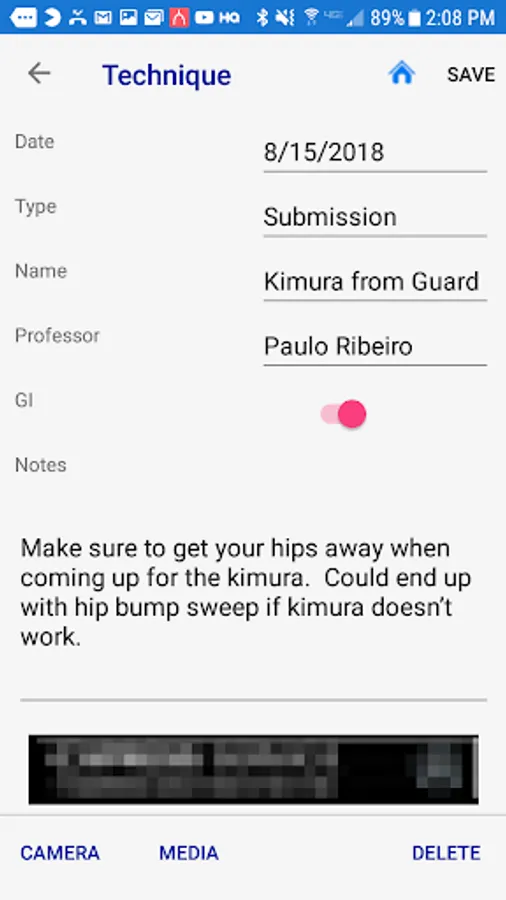 The Techniques function is for recording the techniques you learn. This is great because we tend to learn at least one technique at a class and after a few weeks, it becomes hard to remember everything you’ve learned. As the months and years go by….well you get the idea. Record all your techniques along with notes about the technique like those “hidden” jiu jitsu moves that make the technique work but are easy to forget. And take any pictures and video related to the technique for a reference.