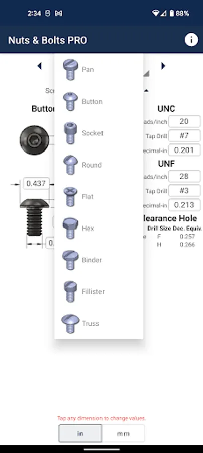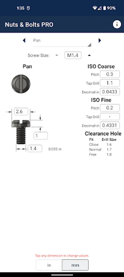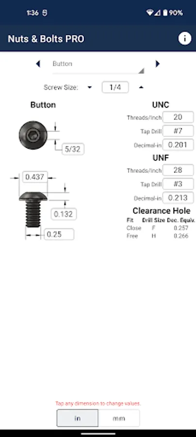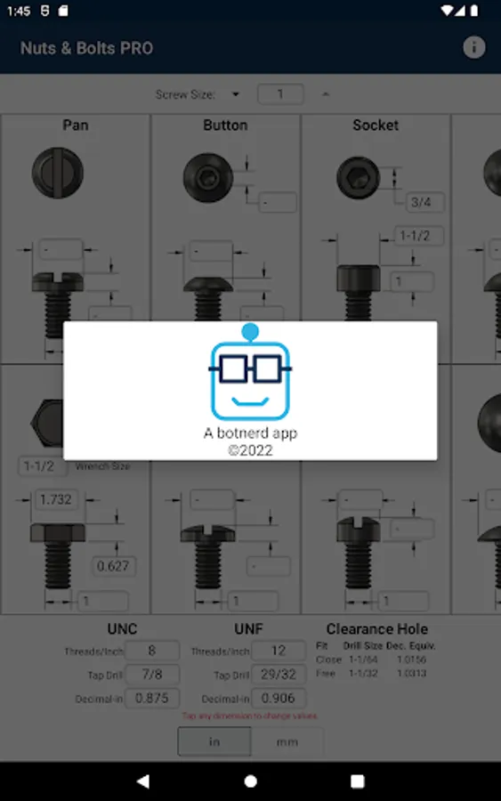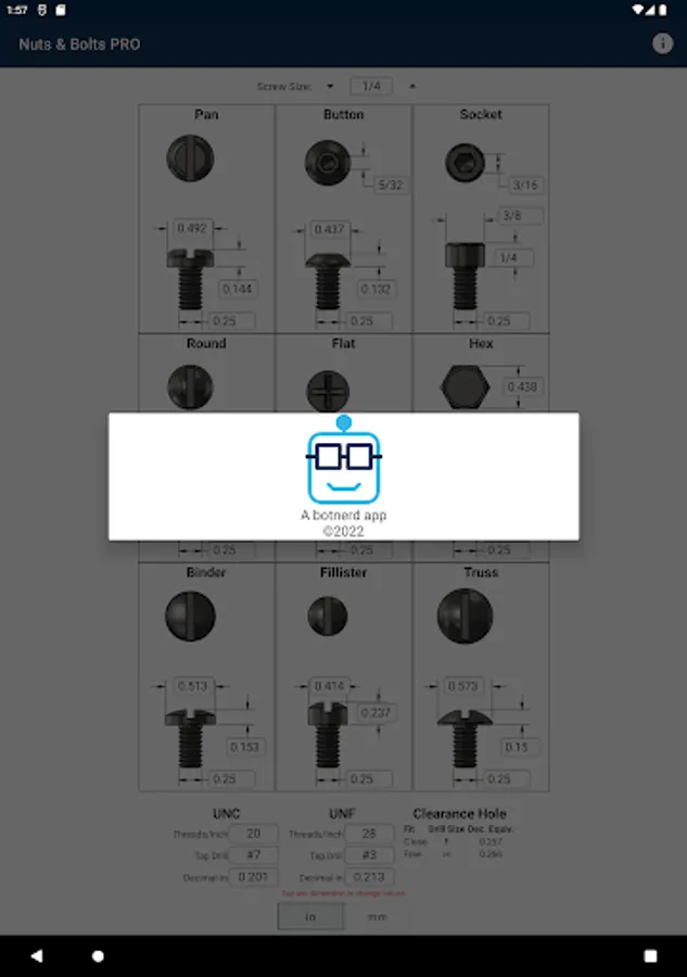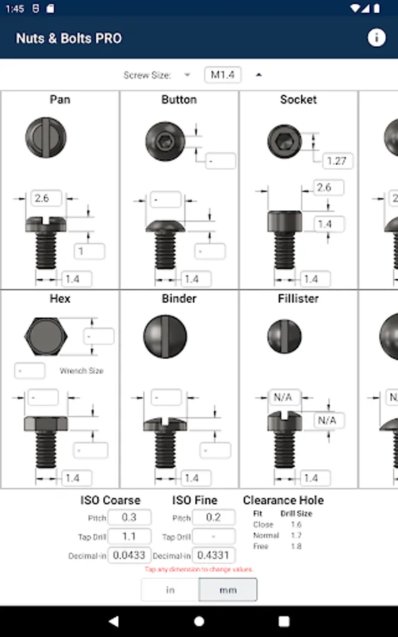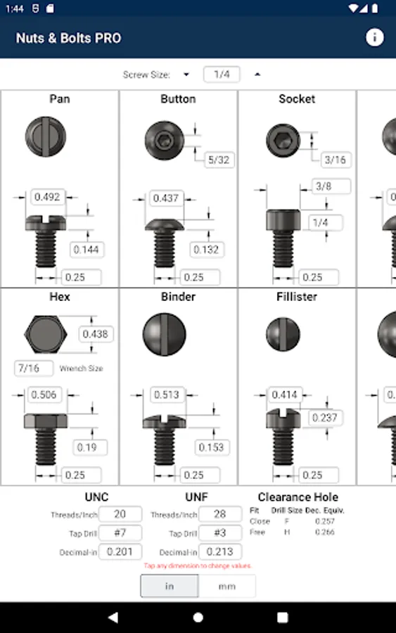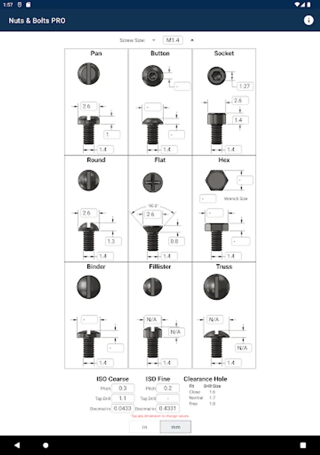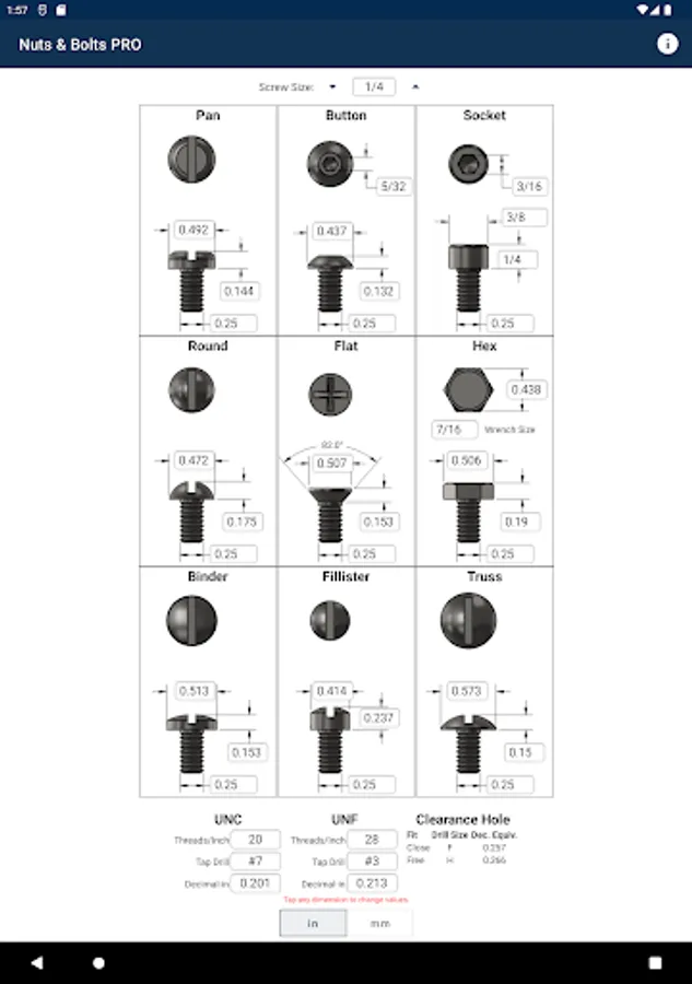 Nuts & Bolts is a simple application to look up screw sizes. It provides screw diameters, screw head dimensions, tap drill sizes, and clearance holes for standard sizes #0 to 1" and metric sizes M1.4 to M24. A simple interface allows you to cycle through sizes and screw types OR tap any dimension to quickly jump to the size you want.