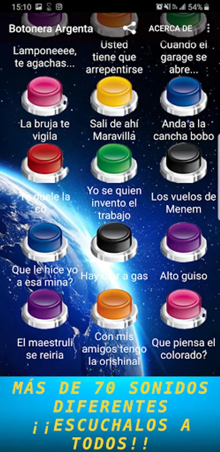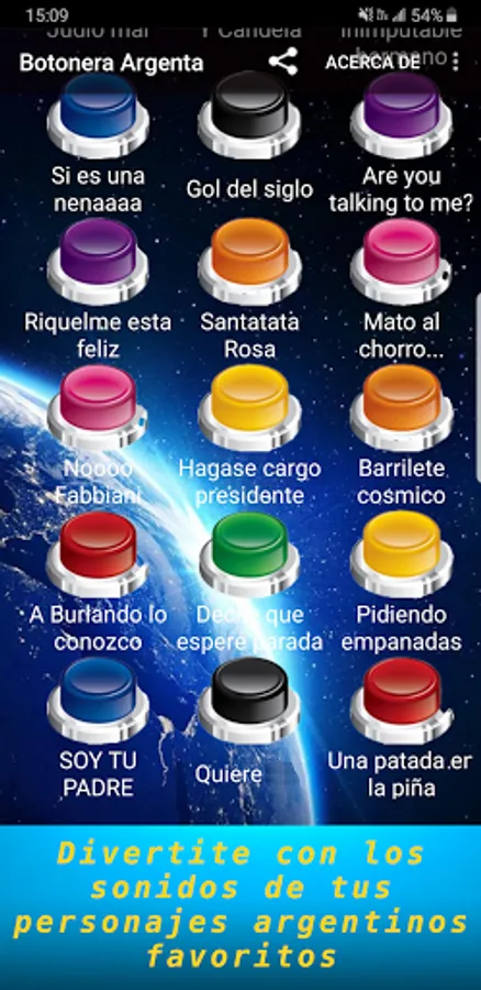 Have fun and share your favorite sounds with your friends. Audios of characters such as Ricardo Fort, Natalia Natalia, Peter Capusotto, El Marginal, Pepe Argento, Yayo, Prestico, Tano Pasman, Marito Baracus, and many more !!