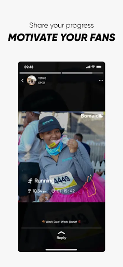 Sharing the Bomaid Wellness Brand: Users can share achievements with their co-workers and friends through their WhatsApp & Facebook Status. Each shared achievement is branded with the Bomaid logo and Team Title, creating a challenge retention hook and simultaneously growing our Brand as a wellness-priority employer.