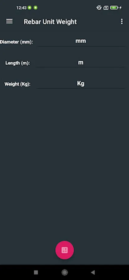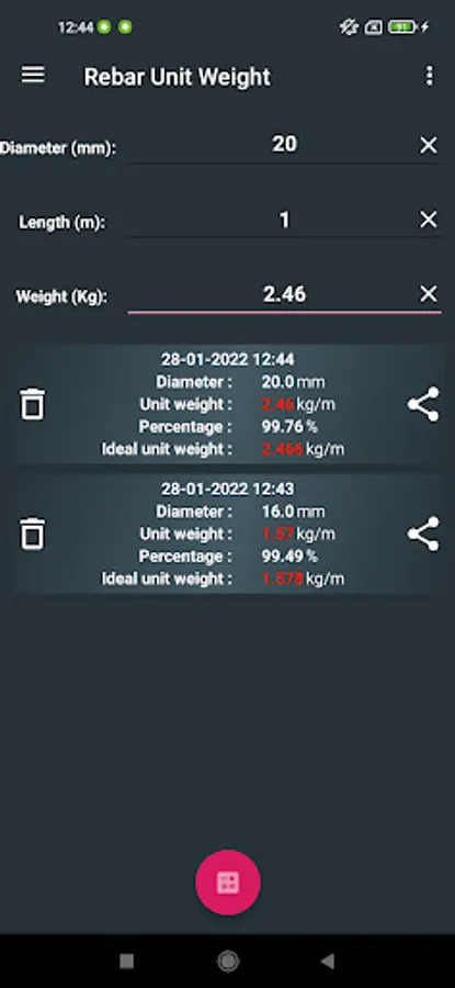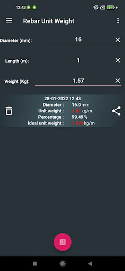 This application is used to calculate the rebar unit weight for any diameter you want, just enter the diameter you want, the sample length and weight have been entered, then click the button, the result will appear to you as follows: