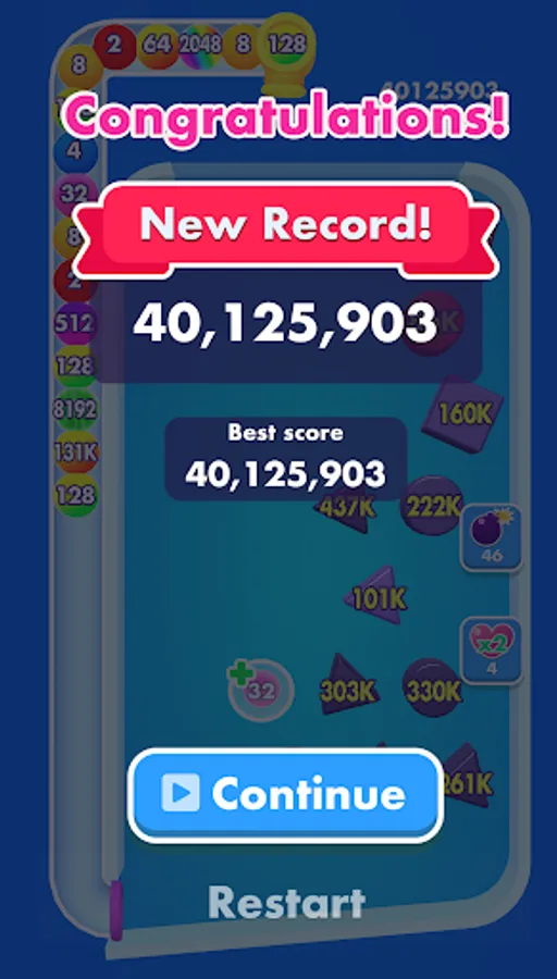 Drag your finger to aim, release to shoot. Destroy the obstacles at the bottom of the screen; if they reach the top, it's game over. And of course, if balls with same number touch, they'll merge and become more powerful.