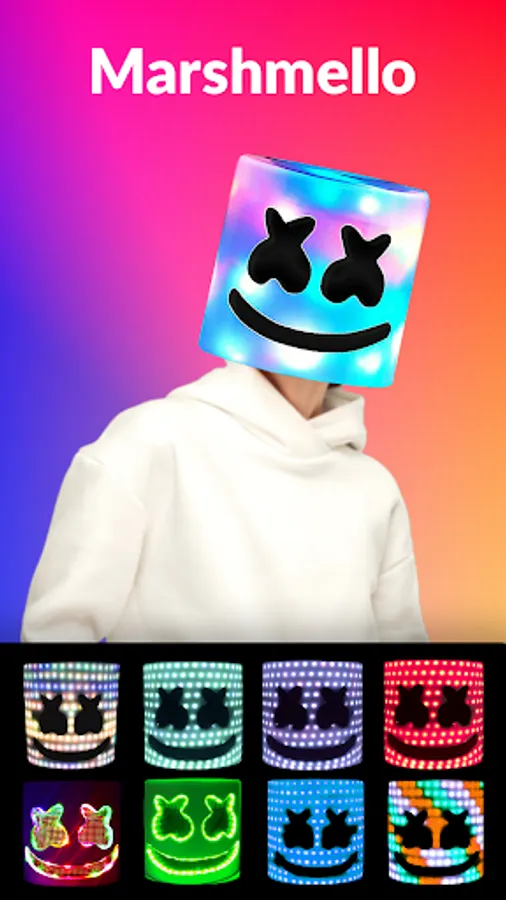 The Marshmello-Themed Photo Editor app which includes typically range of the features and tools to help users customize their images. For example, users can upload a photo from their device's camera roll or take a new photo within the app to use as the base image. They can then choose from a variety of Marshmello Mask Designs to apply to the photos. This masked DJ photo editing app may offer the different marshmello mask effect designs with various colors, shapes, and details, allowing users to choose one of the best that fits their aesthetic preferences.