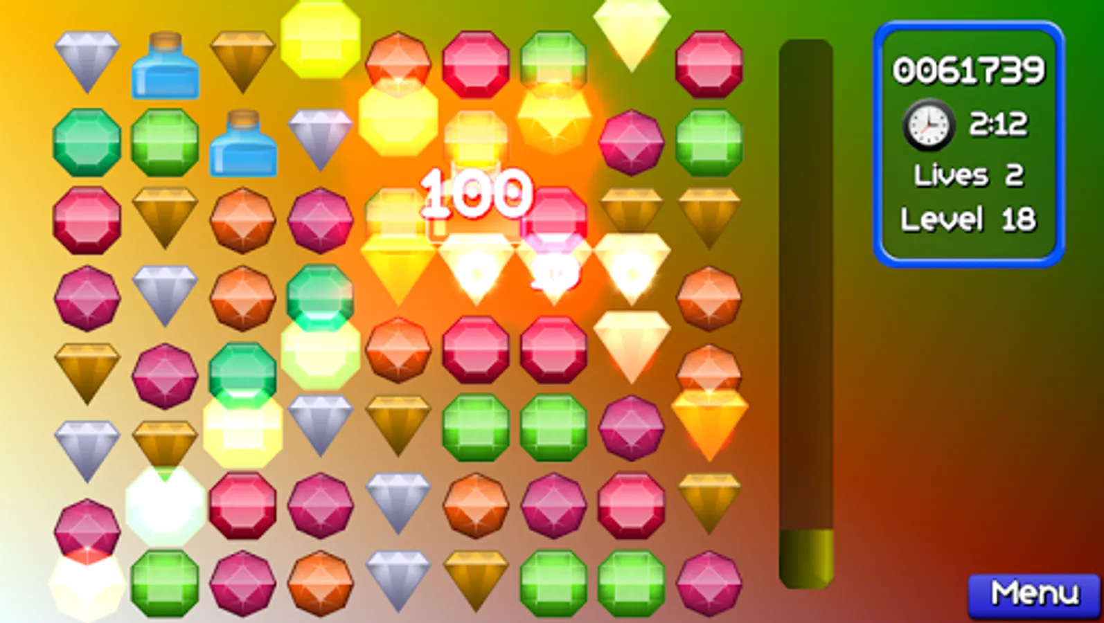 To clear each level, you must complete the fill bar in the right and/or break all the tiles below the gems, you lose a life if the time runs out. You can also activate stars and power potions by making a match touching them.