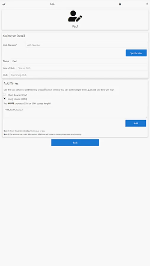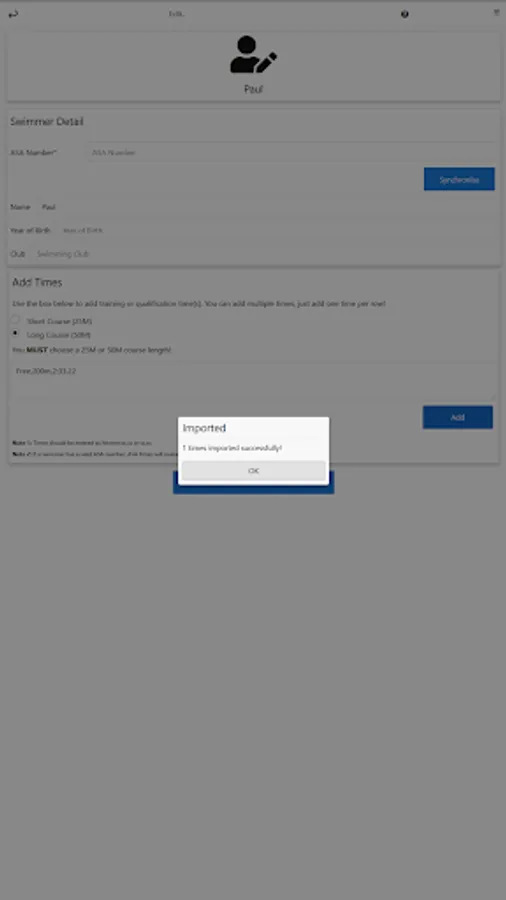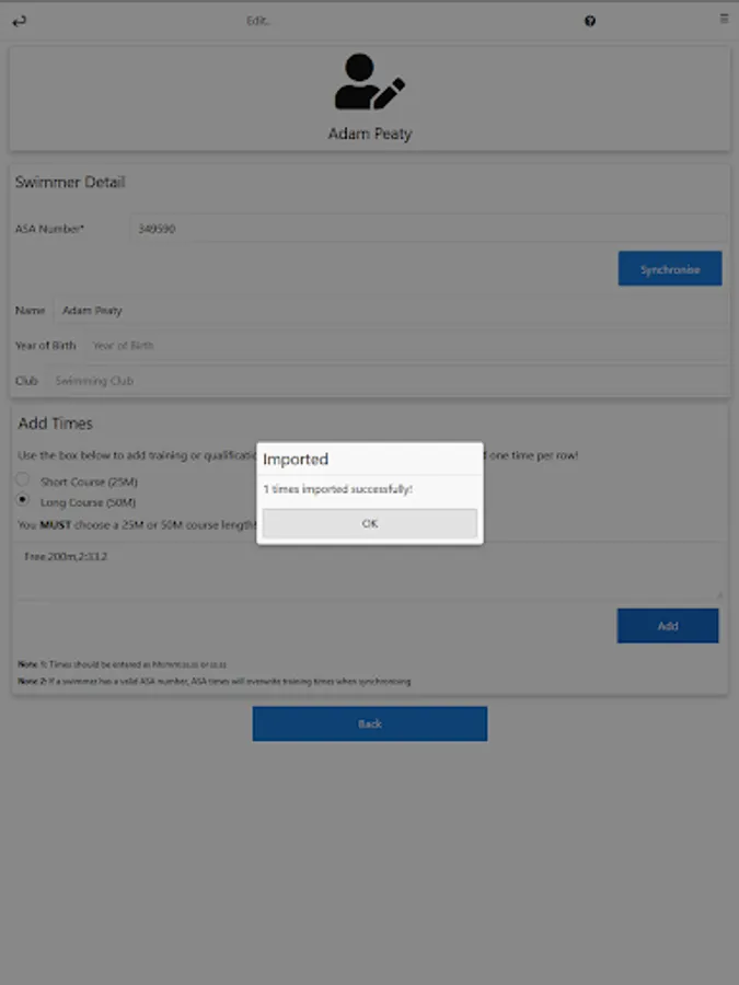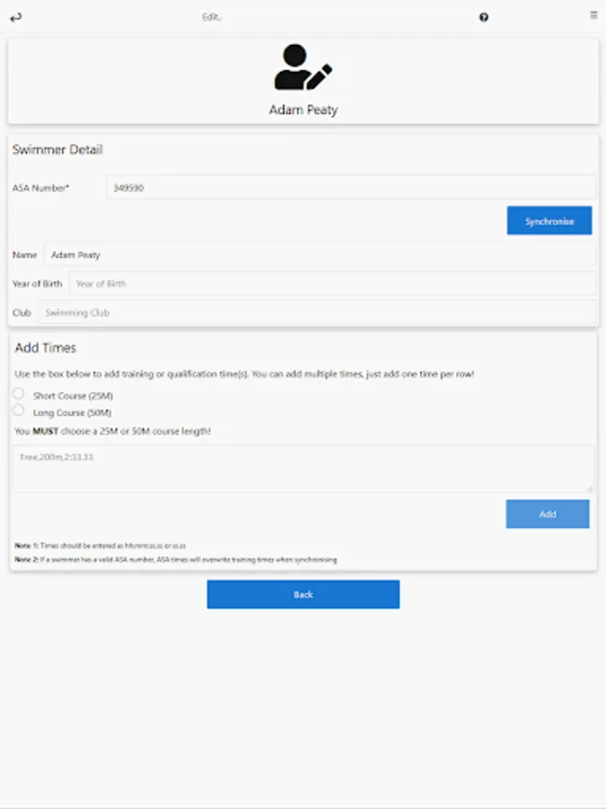 - Pull in a swimmer's times automatically if they have an ASA number (and are based in the UK)