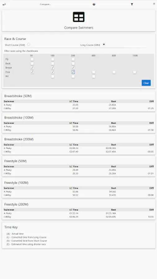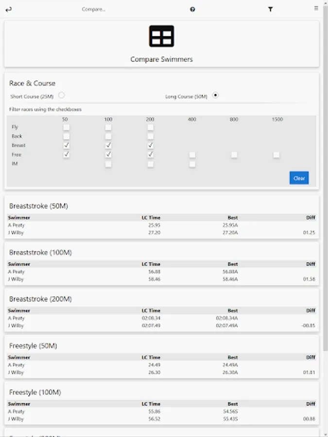 - Compare multiple swimmers for a given course