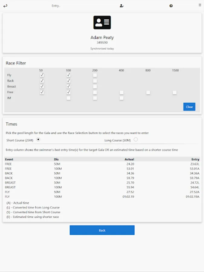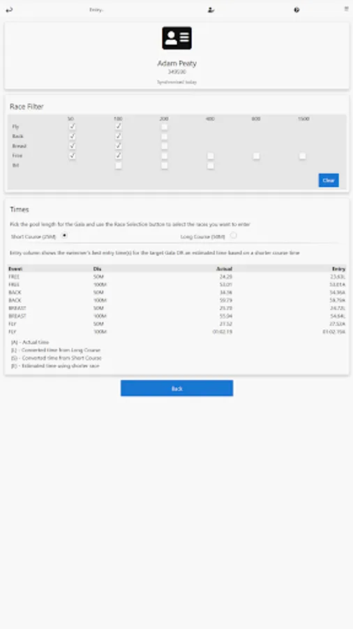 - See a clear table showing a swimmer's 'best' time for a given event and course (for race entry)