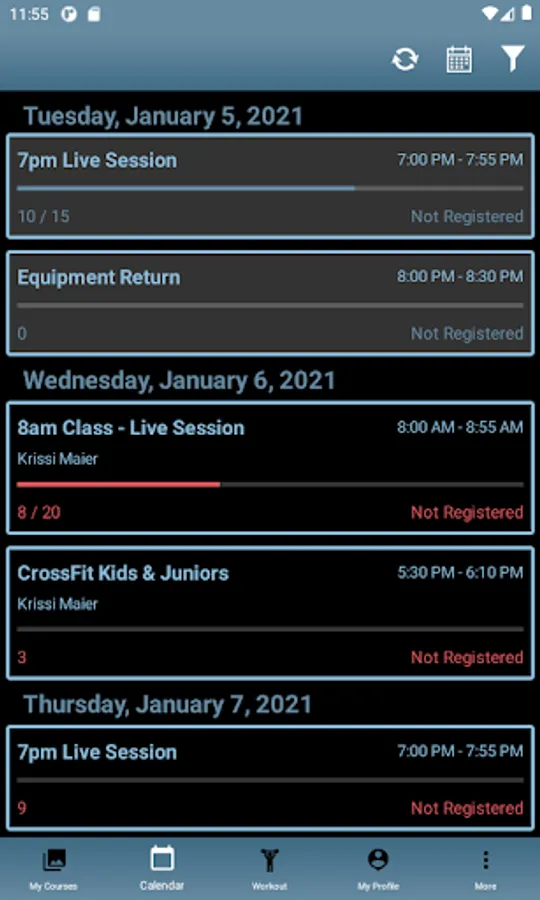 - Search filter: Track, Trainer, Room, Free Sessions, DropIn