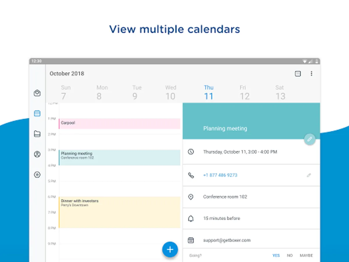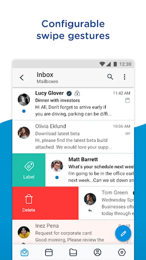 Full-featured calendar management is just a tap away, keeping you on top of your schedule. Easily create and manage events, view calendar attachments, send meeting invites and view availability inside of Boxer.