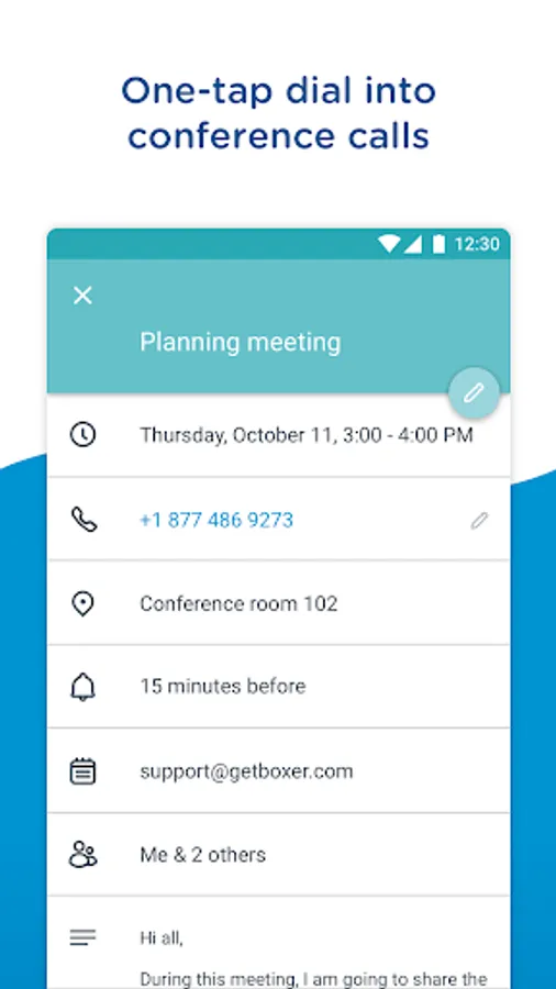 Another phone conference? Say goodbye to flipping back and forth to enter an access code or meeting number on your mobile device. With Boxer, you can instantly dial into conferences with a single tap!
