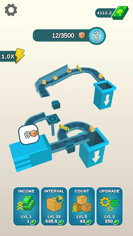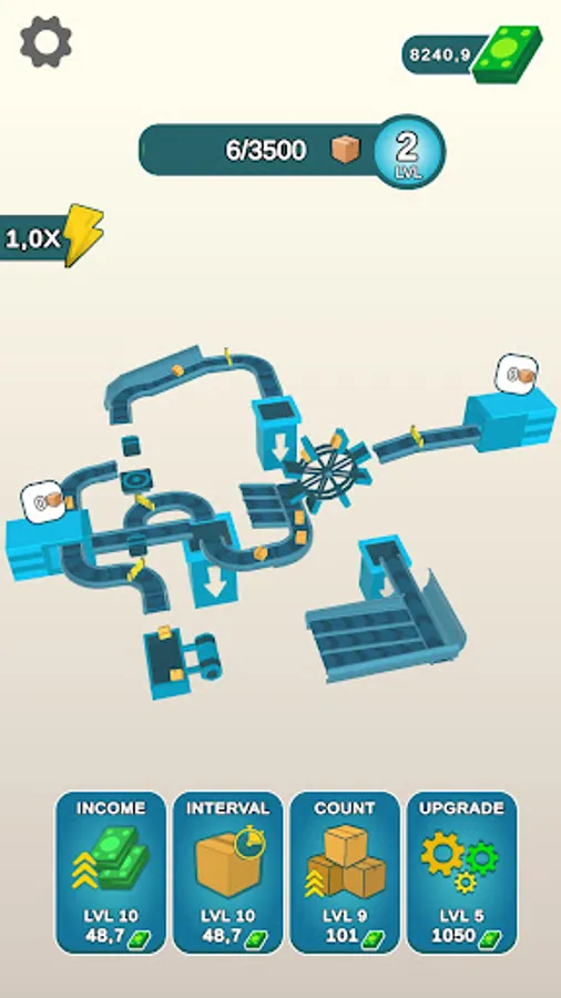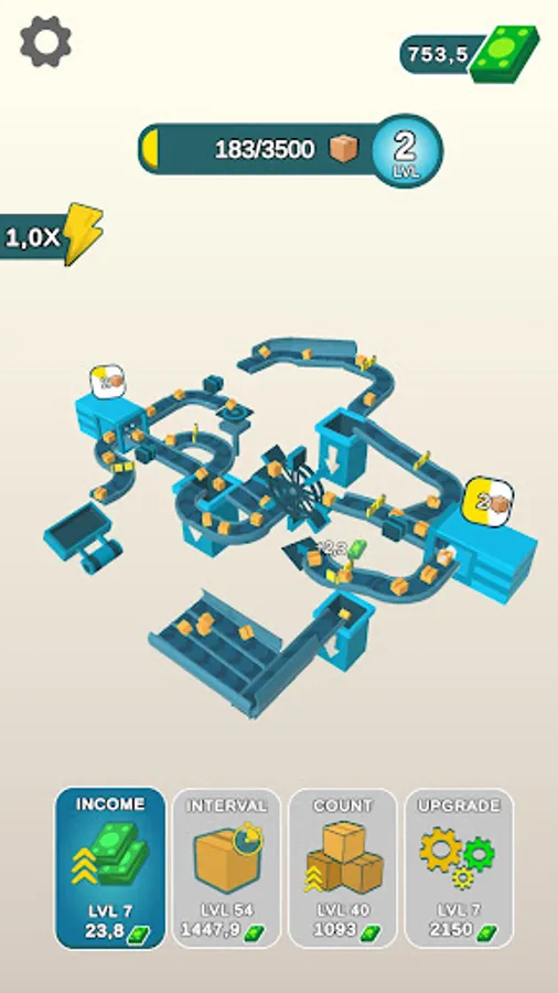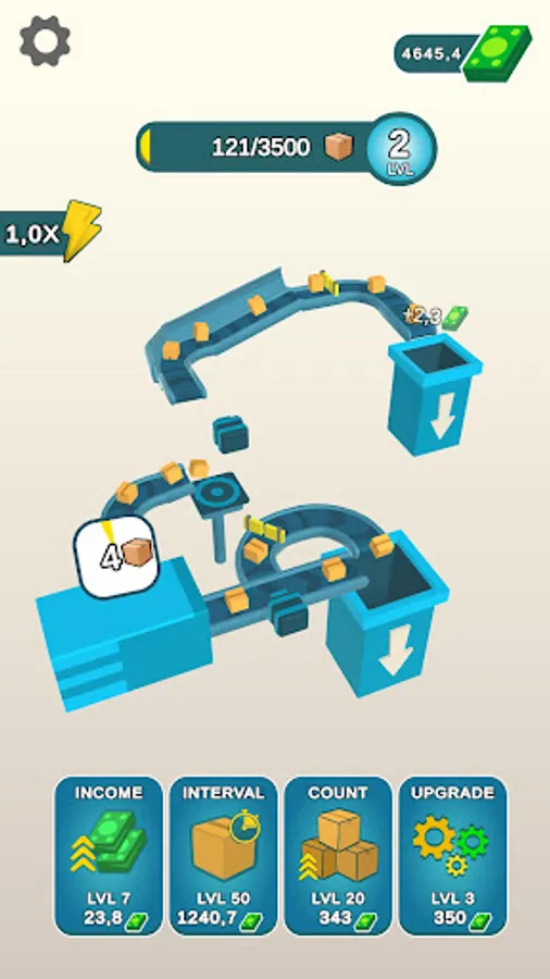 - Upgrade the efficiency of the mechanisms: speed, interval of box spawning and income!