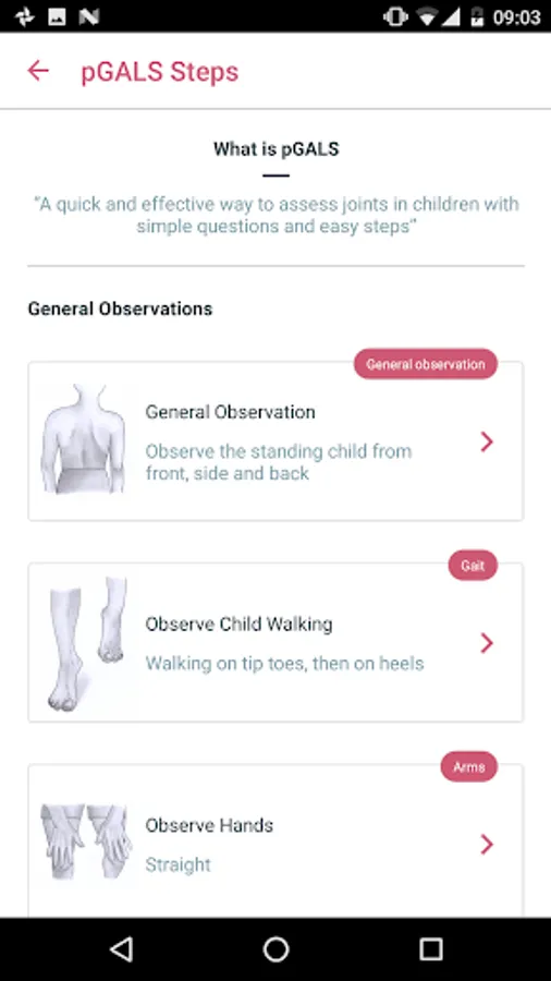 This app is a study aid that takes you through the pGALS (Paediatric Gait Arms Legs Spine) steps with explanatory notes and images and relevant links to additional information.