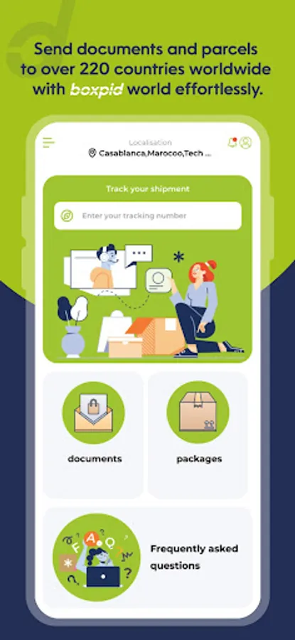 BoxPid is a 100% Moroccan company that has revolutionized the world of international express messaging with an interactive mobile application that leverages the expertise of global leaders in the field and enables simplified management of document and parcel shipments worldwide with a single click. Booking, collection, tracking, and delivery are all included.