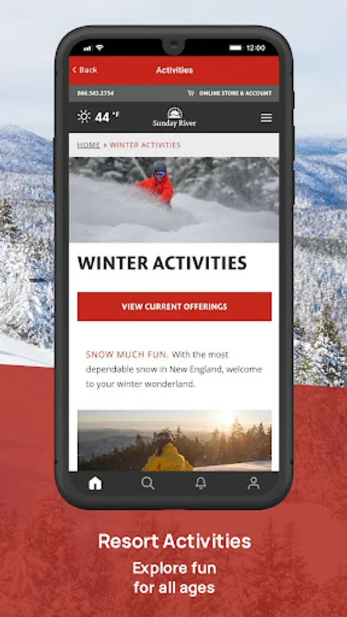 From home, you can use the app to check-in on Sunday River with weather updates, conditions reports, and several web cams. You can also plan your vacation with booking tools for lodging, lift tickets, tee times, and various activities.