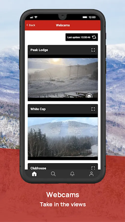 Optional push notifications include snowfall alerts, lift status updates, and on-resort deals.