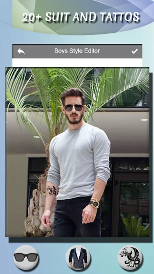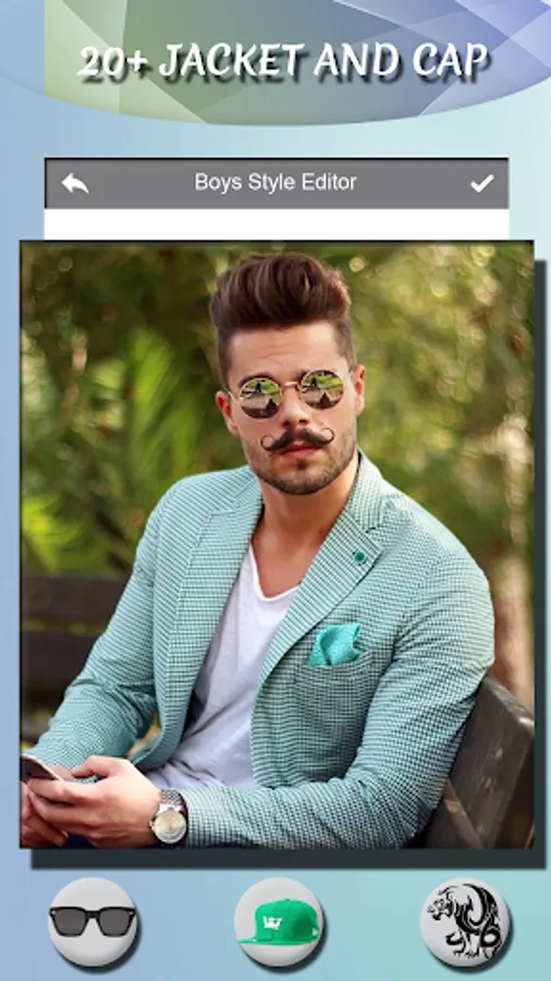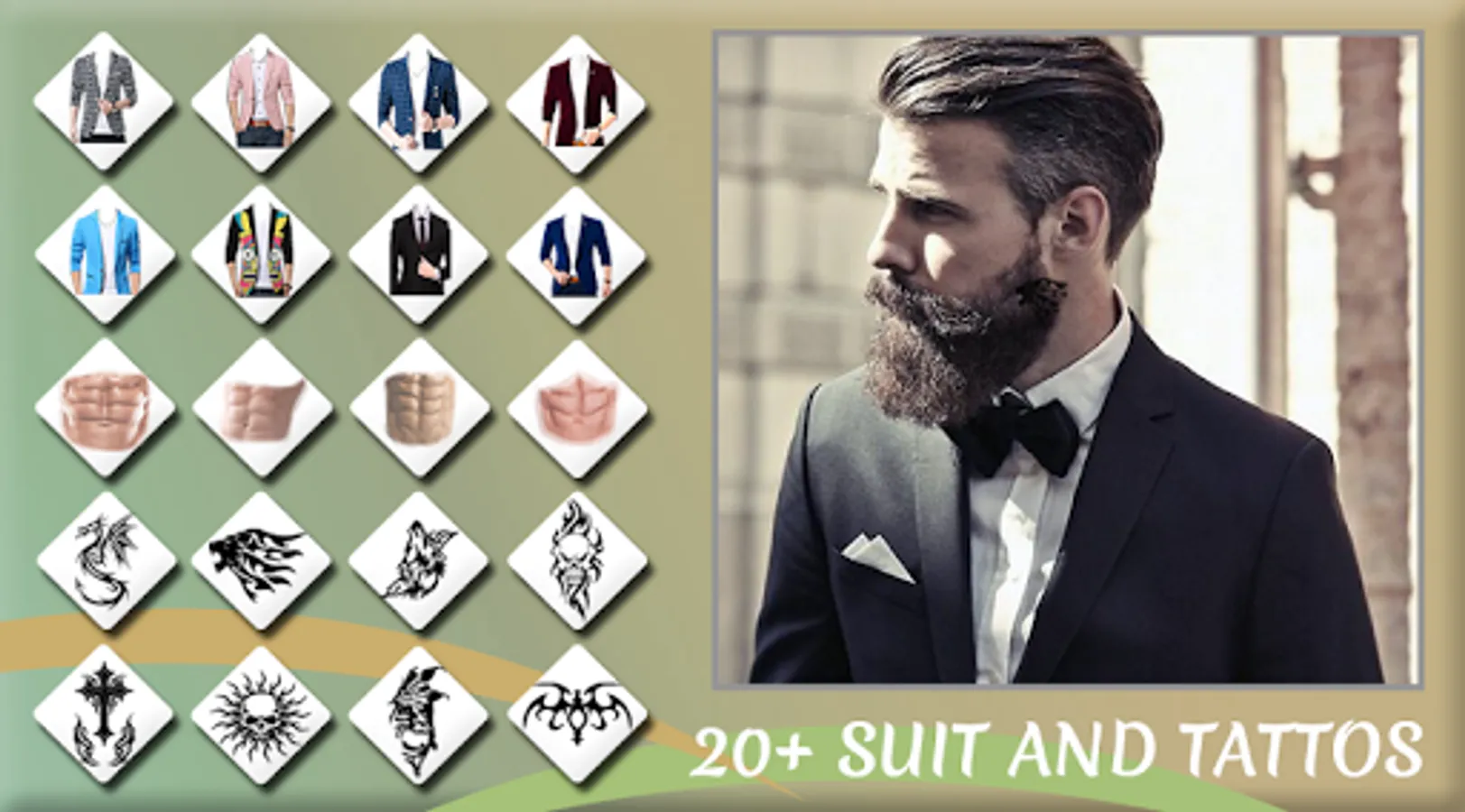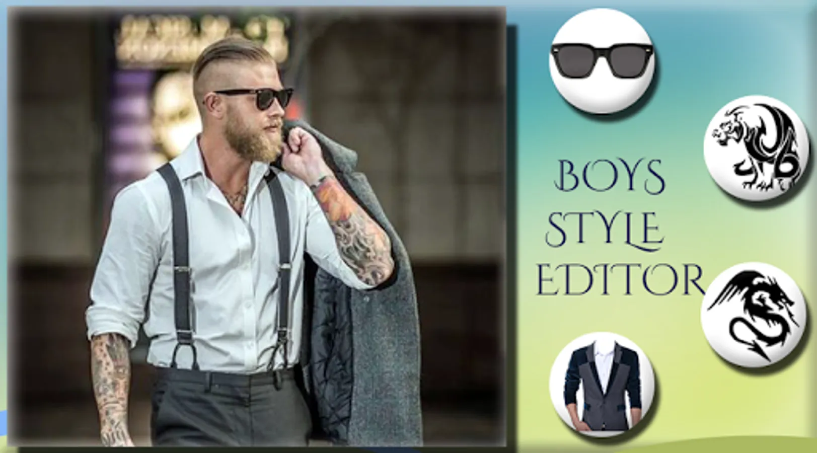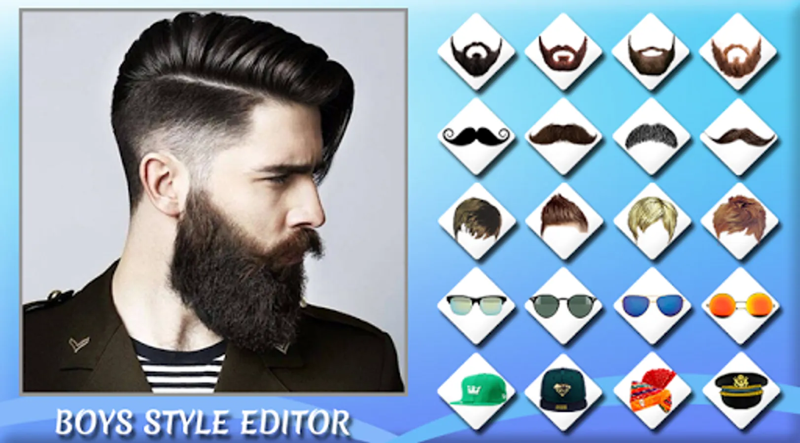 Boys Style Editor app contains latest and new stylish hair style design, glasses, suit, mustache, beard, jacket, six pack, caps and tatoo.