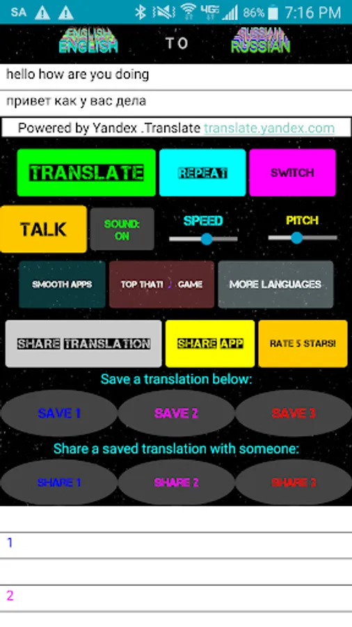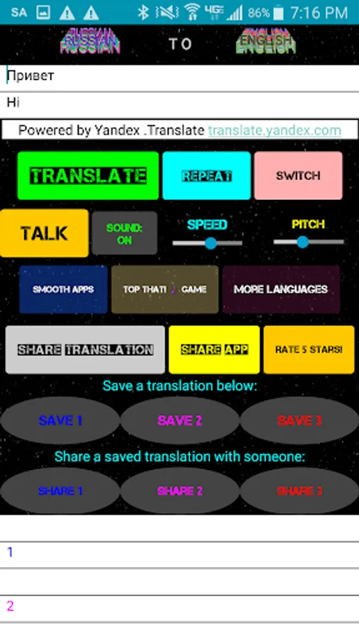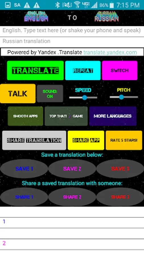 Type the text and press 'TRANSLATE', or just shake your phone and speak. The app will automatically translate the text and speak the translation back to you.