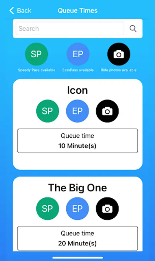Ride Queue times – Get up to the minute ride queue times and book Speedy One's for applicable rides.